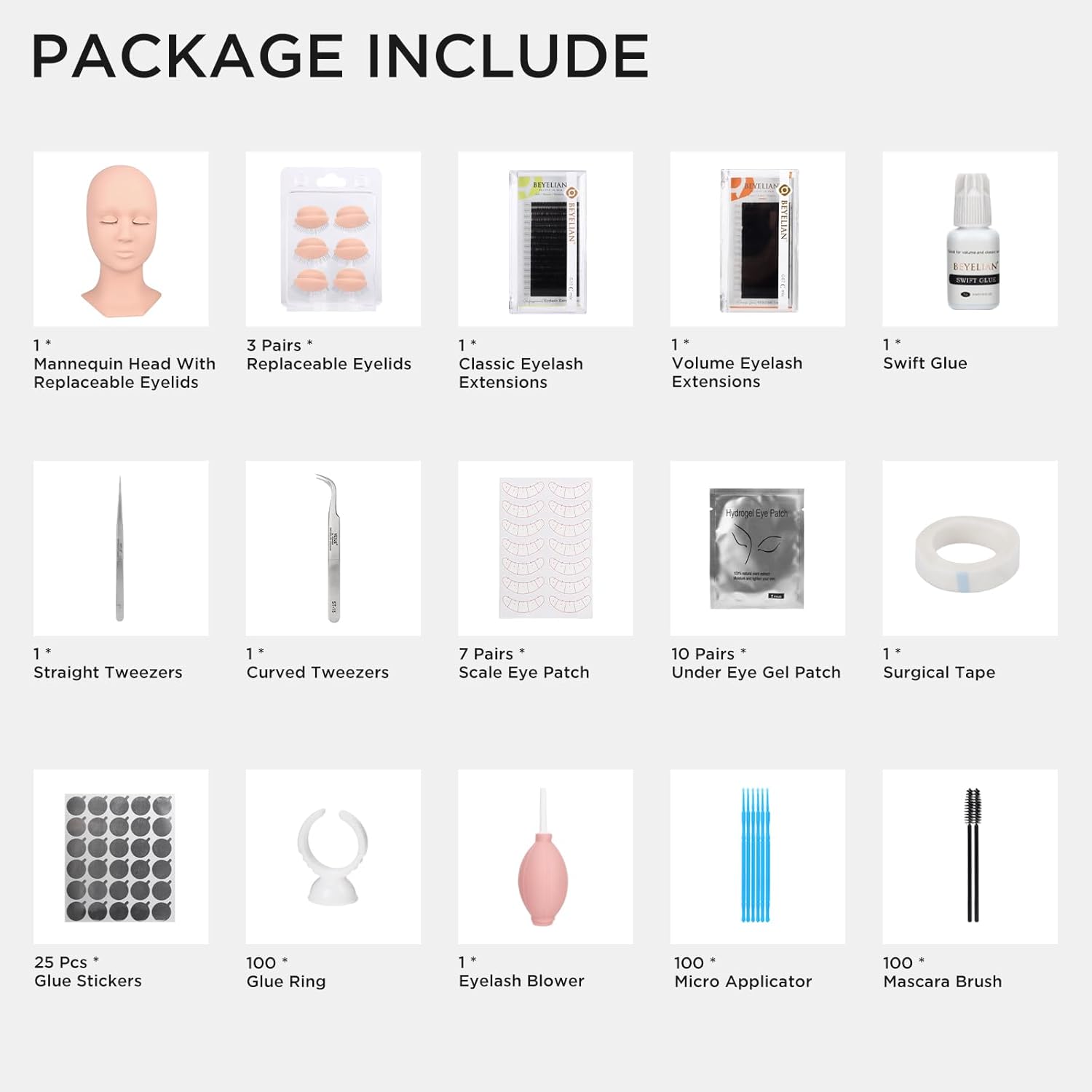 • ✅Eyelash Extension Kit: This eyelash extension kit includes 1 * mannequin head; 3 pairs * replaceable eyelids,1 * classic eyelash extensions, 1* volume eyelash extensions, 1 * swift glue, 1 * straight tweezers, 1 * curved tweezers, 10 pairs * under eye gel patch, 7pairs * scale eye patch, 1 * surgical tape, 25pcs * glue stickers, 100 * glue ring, 1 * eyelash blower, 100 * mascara brush, 100 * micro applicator.