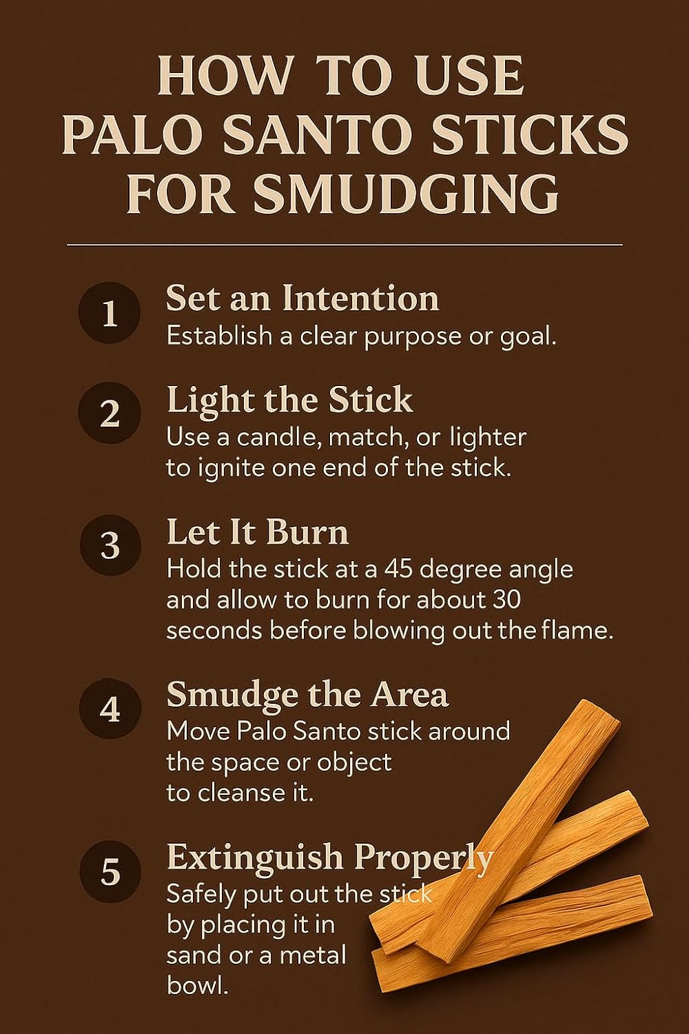 • ✅ Use a match or a lighter to ignite your Palo Santo. Hold your Palo Santo at a 45 degree angle with the point of the stick touching the flame. Let the wood stay lit for 30 seconds, and then blow the flame out. Allow the smoke to fill the space that you need to cleanse. When you are finished, lay the wood with the ignited tip downward in a bowl. It will put itself out.