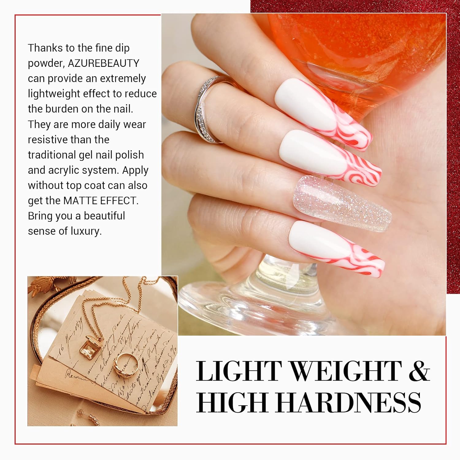 • Superior Quality & Long Lasting: AZUREBEAUTY dip powder nail kit is long-lasting and anti-chipping, anti-peel off. The color is full and natural-looking, light, and has an impeccable shine finish. It can keep the nail art gorgeous and shiny for more than about 28 days with proper application