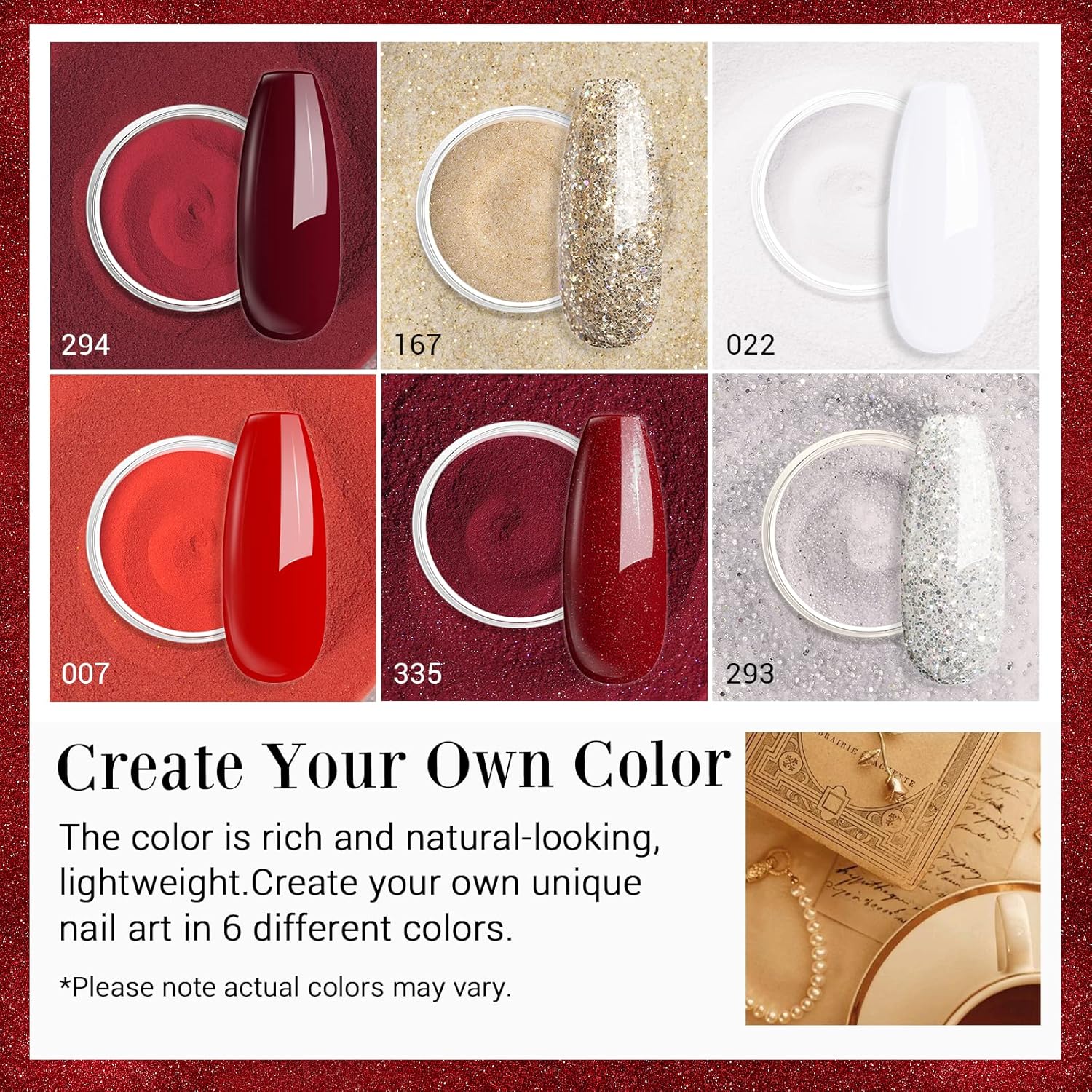 AZUREBEAUTY Dip Powder Nail Set, Red Burgundy Rose Berry Sparkle Milky Snow White Silver Glitter, 6 Colors Dipping Powder Starter Kit French Nail Art Manicure DIY Salon, No Need Nail Lamp Cured