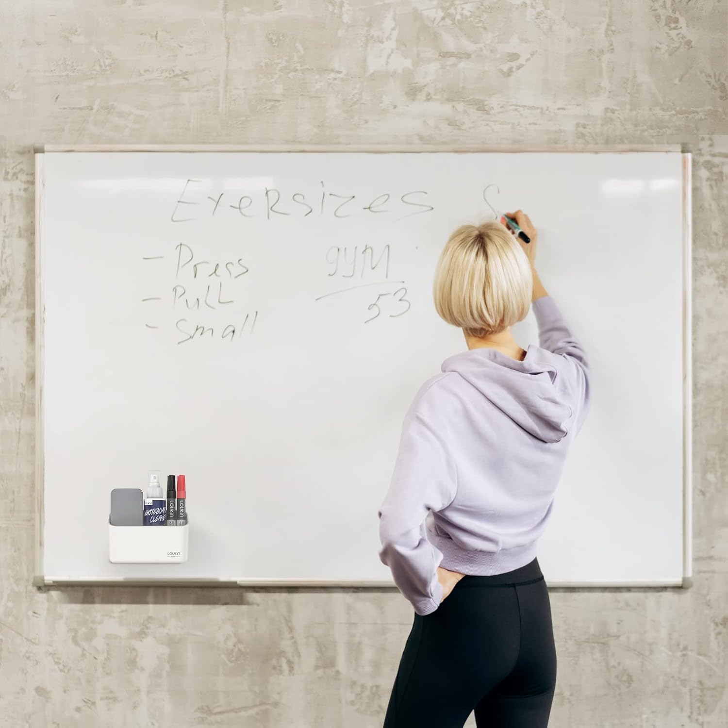 • CONTAINS: 1 marker holder(5.12 x 1.97 x 3.54 in) ; 1Dry eraser grey; 2 dry erase markers with En713 certification; 3.4 oz cleaner with AP certification;2x longlasting adhesive, 2x strong magnet