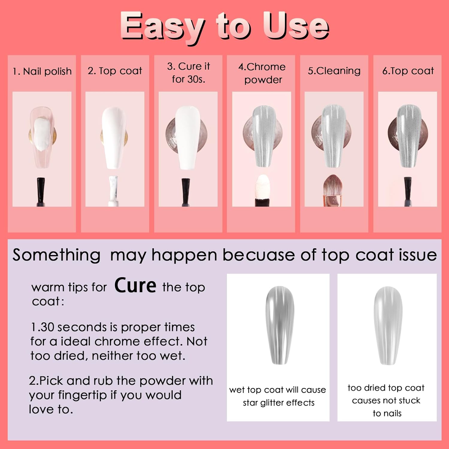 • Ultra Excellent Texture: The powder is fine and smooth without particles feeling, so you can make your nails exquisite with an amazing mirror effect. And the powder is non-toxic, more durable, and environmentally friendly, which does not harm your nails and skin, using it more at ease. Make mirror effects for your nails with our excellent equality chrome powder set.