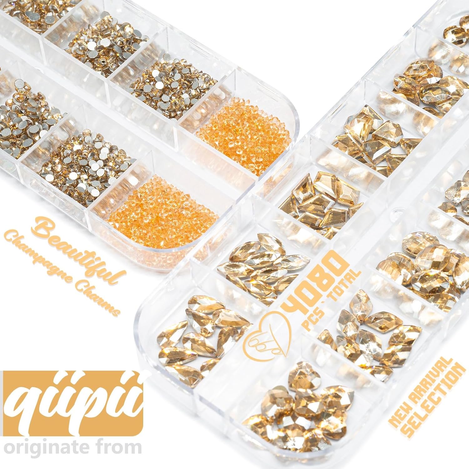 • ❤【12 Kinds Shapes Flatback K9 Glass Rhinestones】12 kinds different of kawaii shapes, each includes 10 pcs, total 120pcs. The shiny diamonds stones for nail are designed with different style, like heart rhinestones, diamond rhinestones, round rhinestones, rhombus rhinestones, arrow rhinestones, oval rhinestones, Horse eye rhinestones, melon seed rhinestones, water drop rhinestones etc. Champagne Gold crystal rhinestones w built-in flat backs can be easily applied to natural and artificial nails.