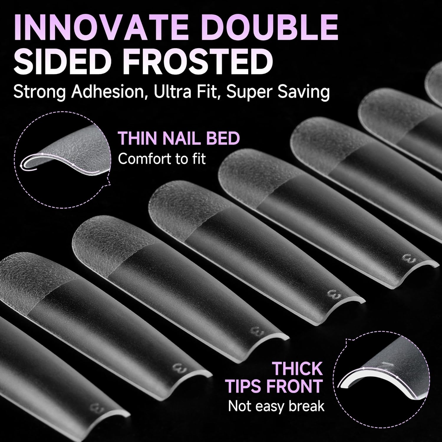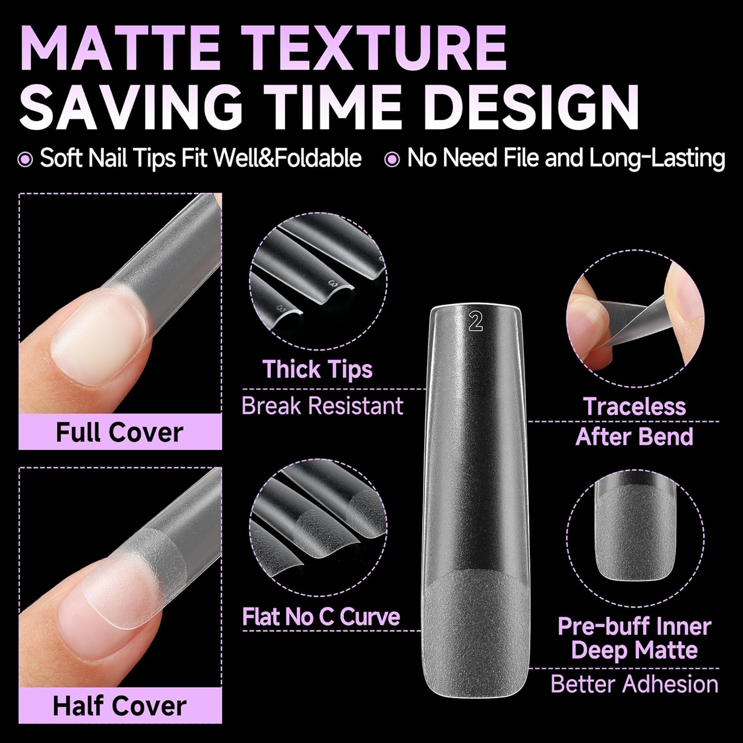 • Easy to Use: Our smooth edge of tips have a more shallow curve, convenient to press on nails beds tightly, without feeling uncomfortable "tightness", keep the color good without separation or exposure, your nails will look more naturally. Pre-shape tips no need file and saving much your time, more sturdy sticking.