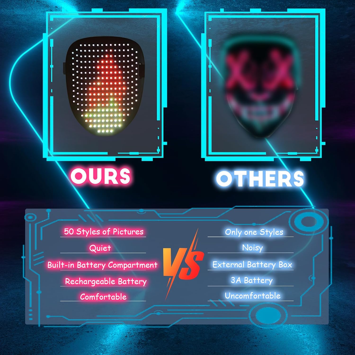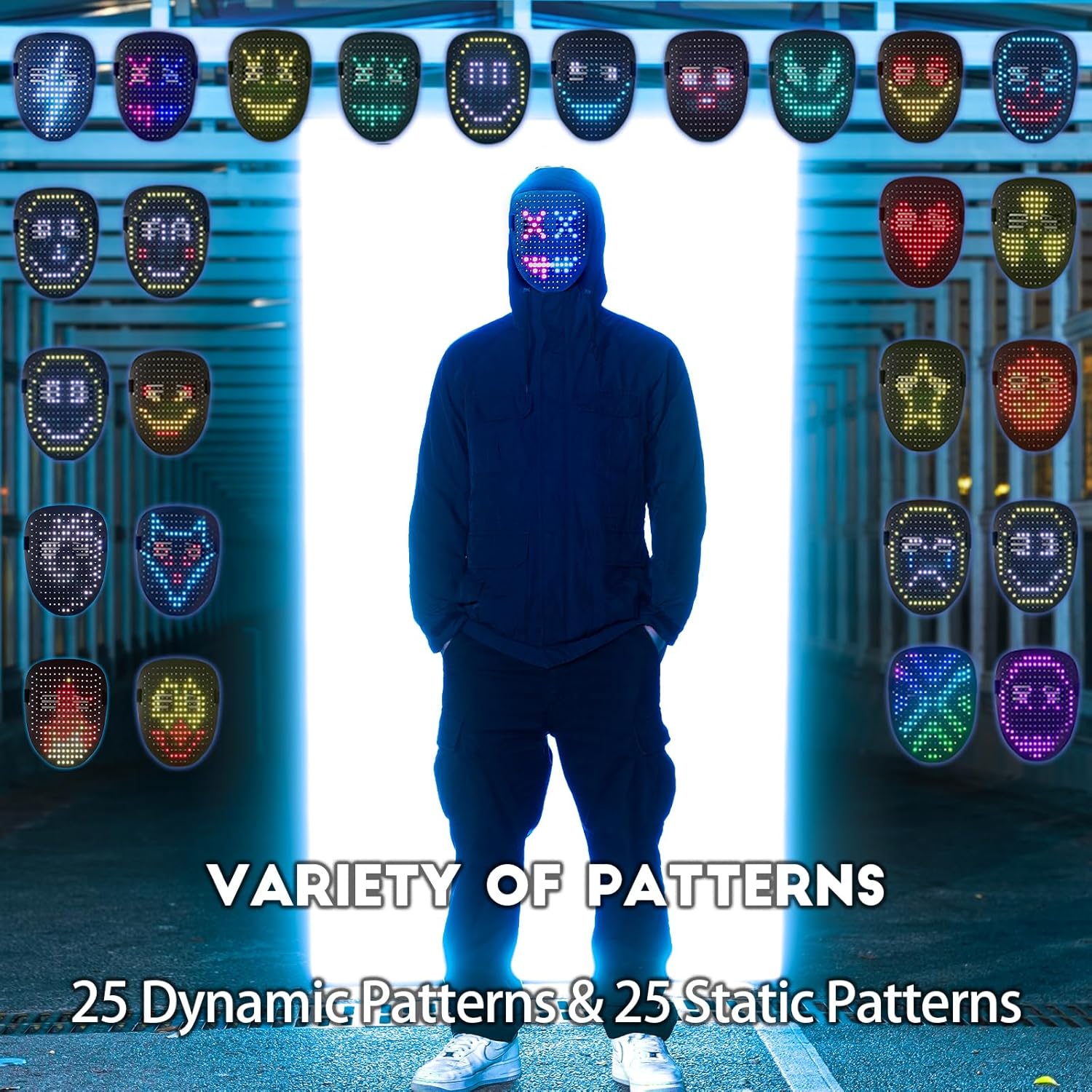 • [50 Patterns Fantastic Display]: Led Mask has 25 dynamic display modes and 25 static display images, led full face mask is Most Amazing Costumes&Cosplay apparel mask, attract everyone's attention.