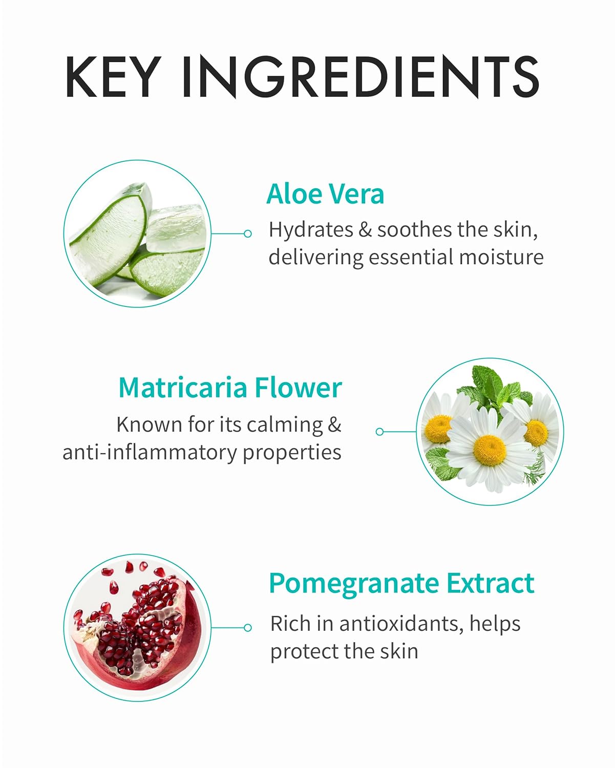 • HYDRATING INGREDIENTS: Aloe Vera, Matricaria Flower Extract, and Pomegranate Fruit Extract provide deep hydration and intense moisture. Aloe Vera soothes and calms, Matricaria Flower Extract reduces inflammation, and Pomegranate Fruit Extract offers antioxidant protection. This blend keeps skin soft, smooth and well-moisturized for a healthy, vibrant complexion.