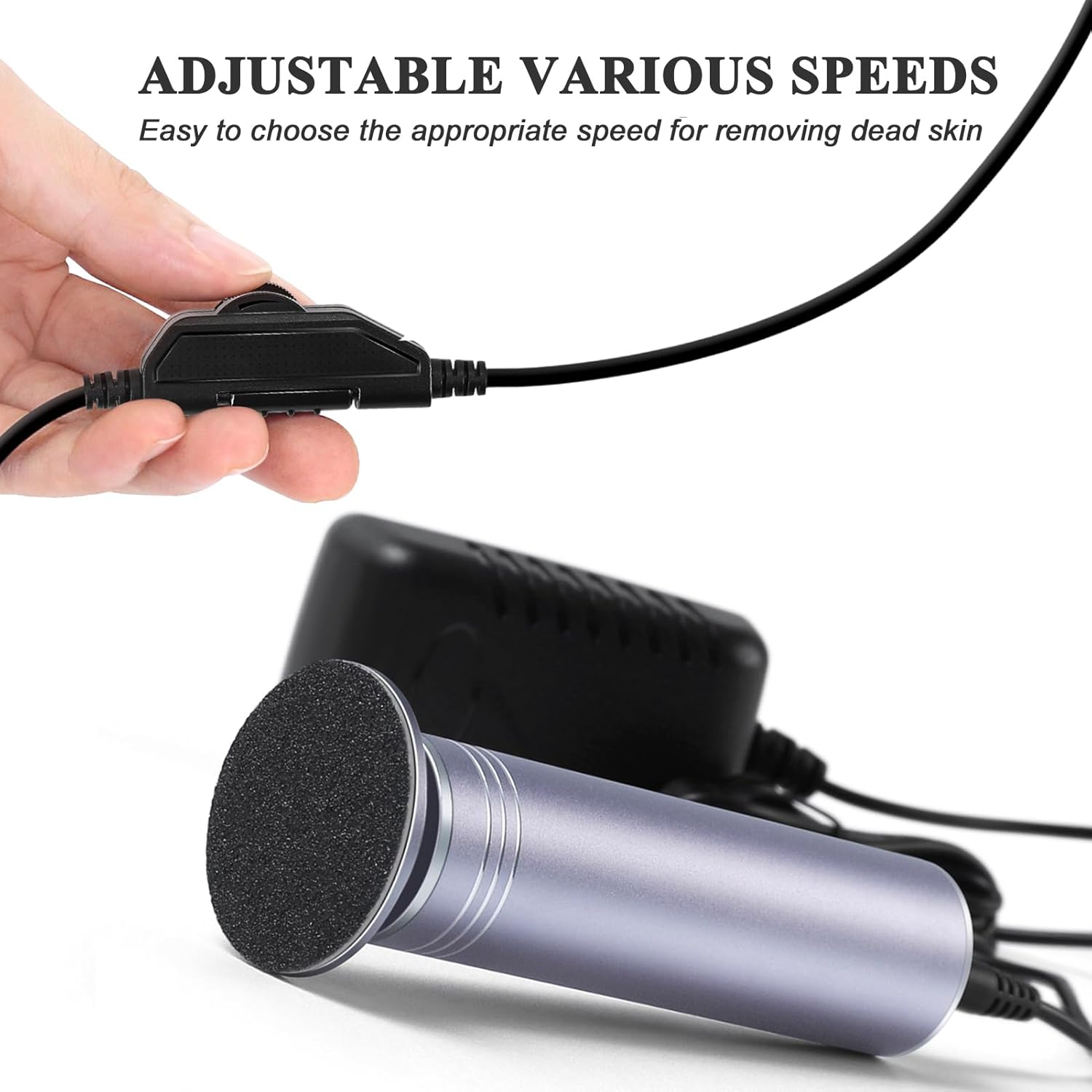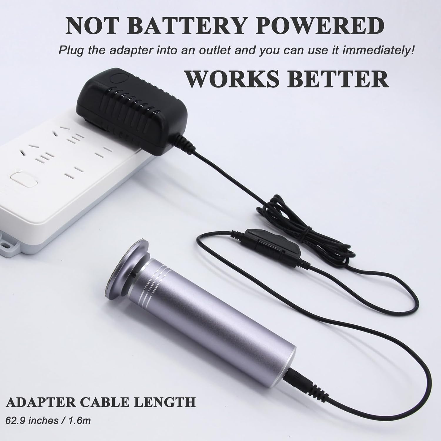 • NOT BATTERY POWERED, STRONG POWER: The electric callus remover is not battery powered, don't worry about low battery issues when using it. You just need to plug the adapter into an outlet and you can use the electric foot file right away.