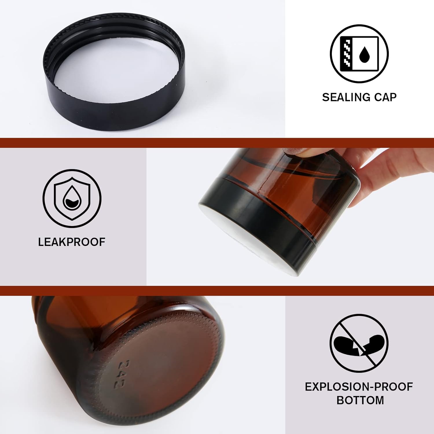 • Airtight Leak Proof: Don't worry about getting your cosmetic bag wet! The amber glass jars came with an Inner liner and the glass jars' tight thread fits perfectly with the glass bottle cap to protect the lotion and essential oil from leaking. Our empty airtight glass jars can be reused to reduce waste