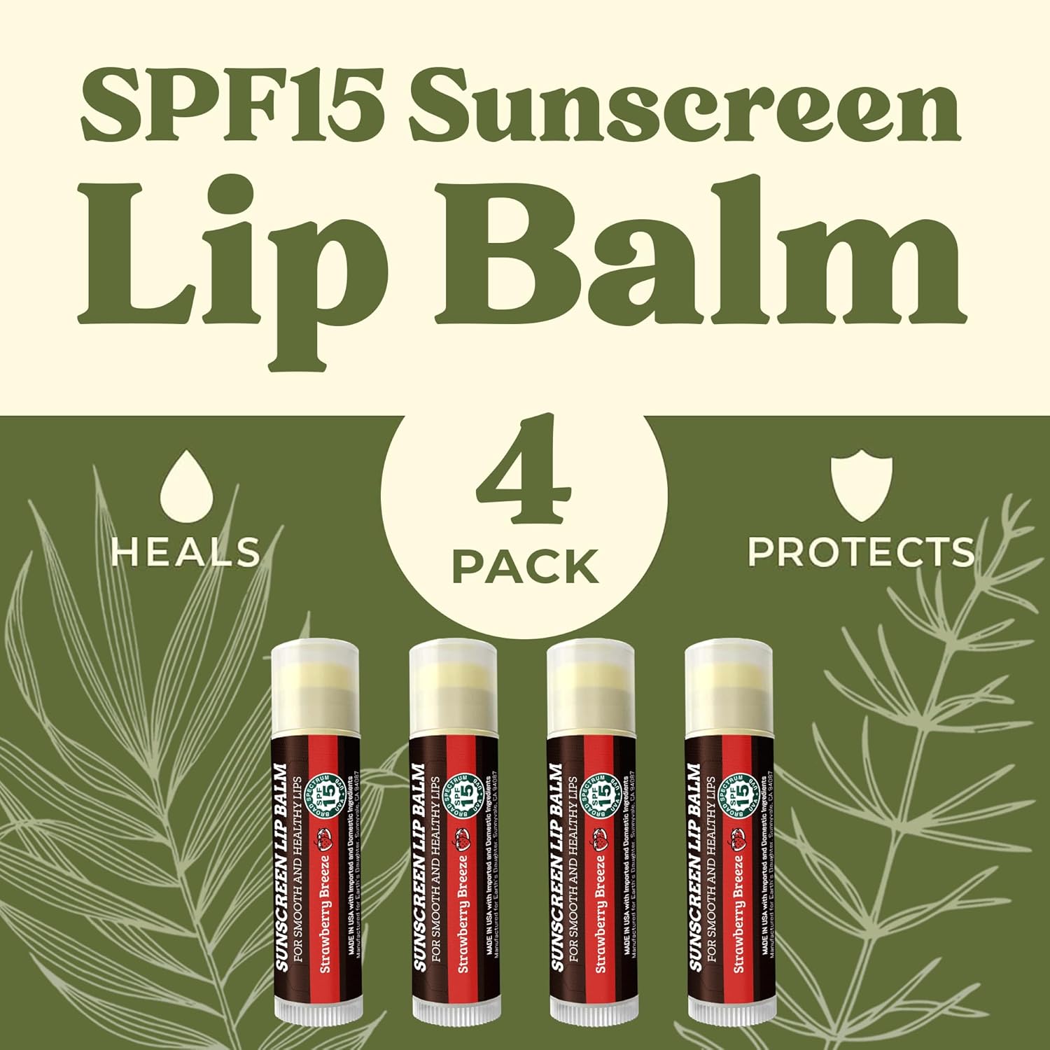 • 4 PACK of SPF 15 SUNSCREEN LIP BALM – Delicious Strawberry Flavor. Everyone loves our strawberry lip balm with SPF 15 sun protection, organic beeswax, organic coconut oil and other premium organic hydrating ingredients to protect and moisturize all day long. Our lip balm is great for everyday protection and safe for the whole family