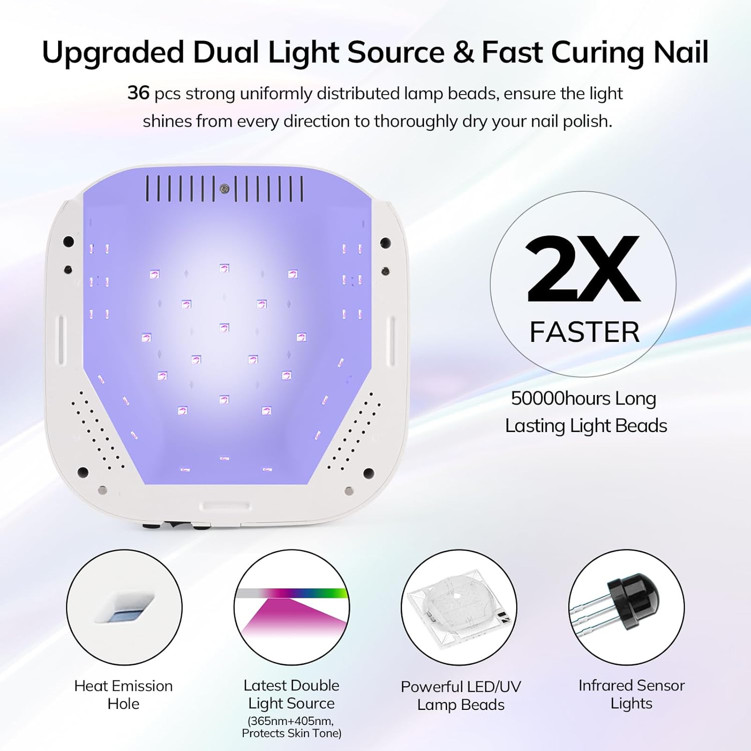 • 【Dual Light Source & Fast Curing Nail】Lavinda gel UV led nail lamp comes with 30 dual light source lamp beads, the UV light shines from all directions and dries gel nail polish quickly. And the light is soft (365nm+405nm) and not glaring which won't hurt your eyes and without tanning your hands. This flash cure lamp can fast dry all types of gel nails. (not for regular nail polish)