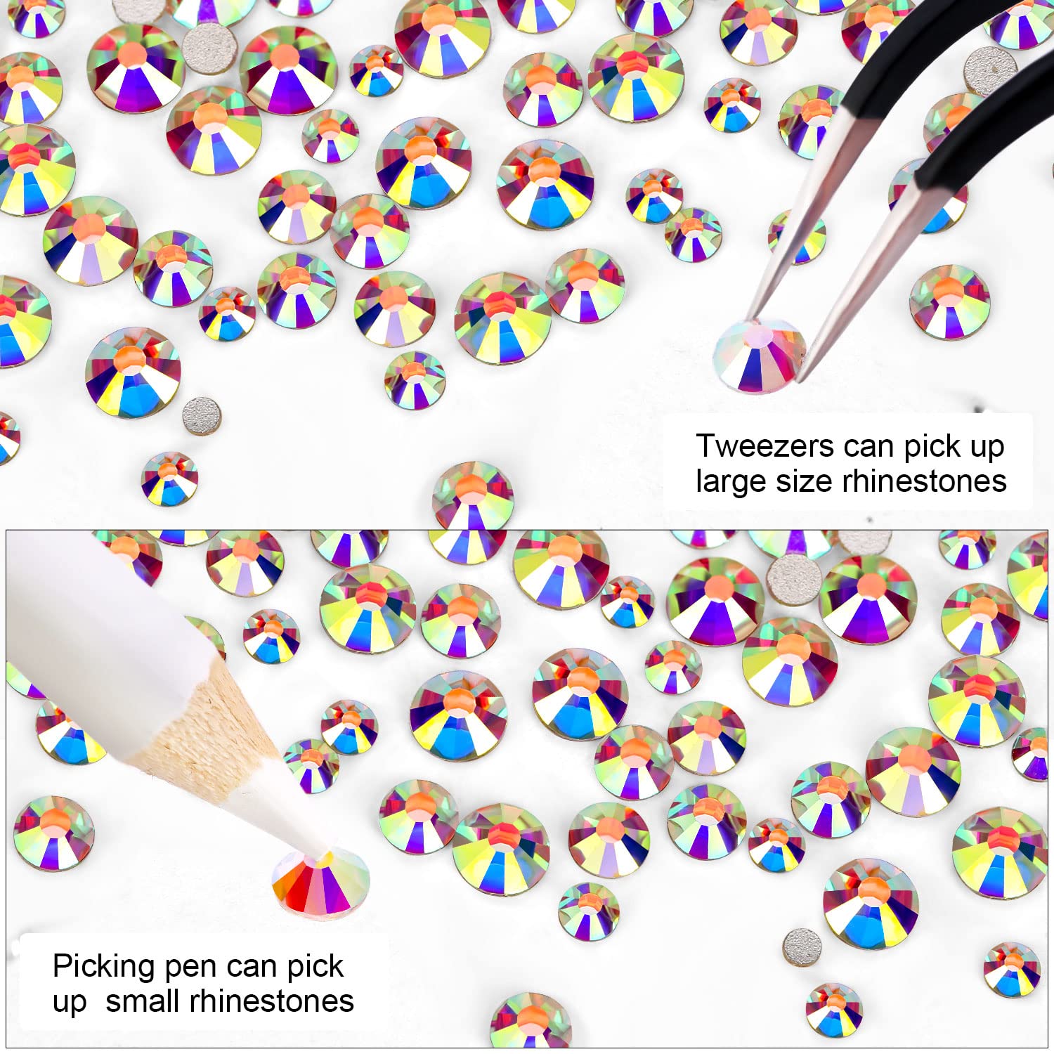 • 💎Use tweezers and Picking Pen gem picker to pick rhinestones, There is no glue on the bottom, additional nail gel is required, or other professional glue for makeup or nails. Can use E6000 super glue to fix on crafts, art decoration. not hotfix.