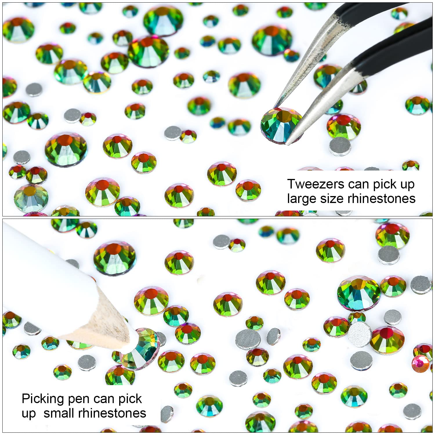 • 💎Use tweezers and Picking Pen gem picker to pick rhinestones, There is no glue on the bottom, additional nail gel is required, or other professional glue for makeup or nails. Can use E6000 super glue to fix on crafts, art decoration. not hotfix.