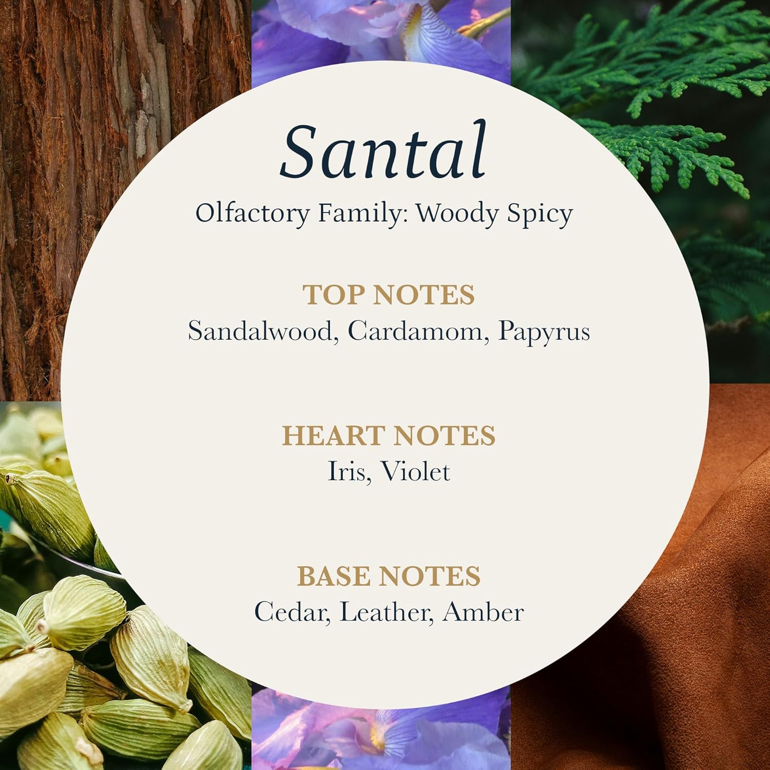 • Santal aroma oil: a deep earthy and extremely woody aroma that combines sandalwood, papyrus and cardamom with a floral heart of iris and violet flowers. a warm base of cedar, leather, and amber finishes this fragrance inspired by le labo's santal 33, just to make you feel like sitting in front of a campfire on the broad plains of the american west.