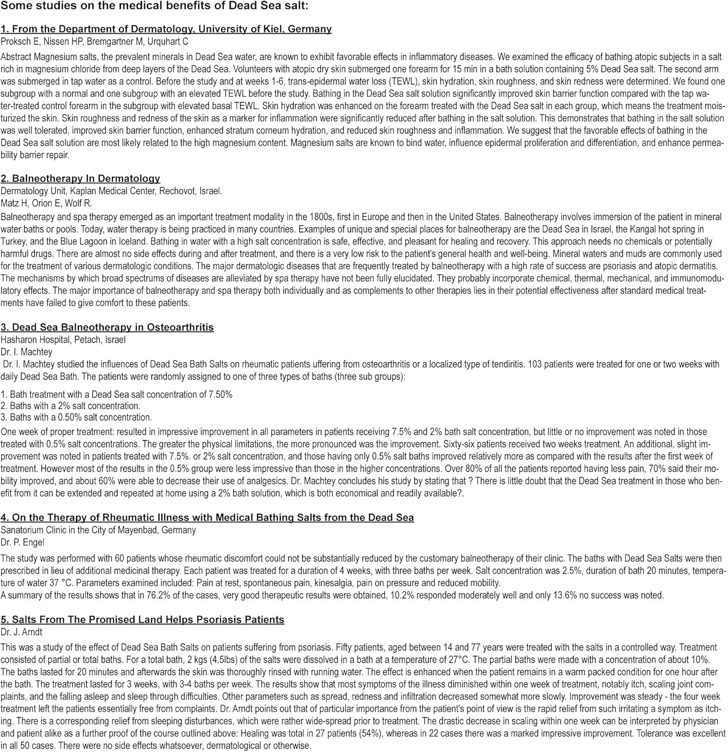 • Proven: published studies show that 80%-90% of patients undergoing Dead Sea mineral treatments experience significant improvement in arthritis and skin conditions including Psoriasis and Eczema. A list of studies is included above.