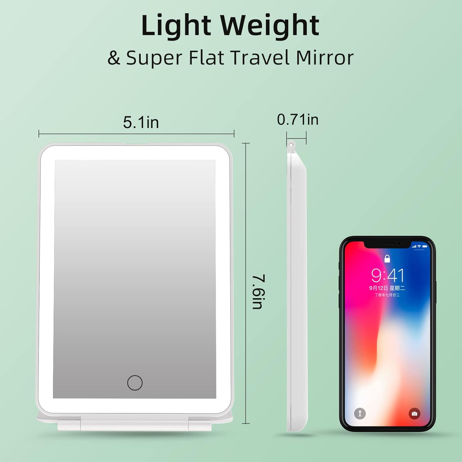 • TRAVEL LIGHTED MIRROR:This foldable rechargeable mirror with lights is 5*7.5 inch,334g,just a ultra-thin Ipad Mini Size.The slim, lightweight and compact design makes the Eclipse your new travel buddy