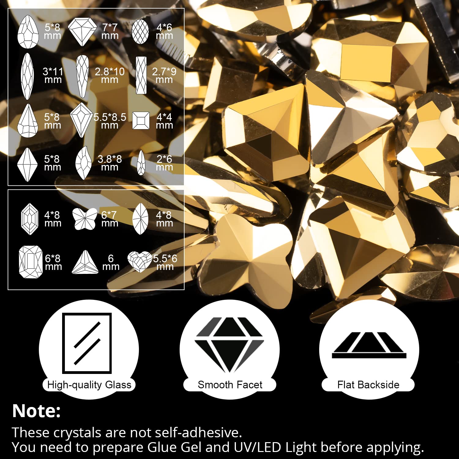 18 Styles Multi-Shaped Glass Gemstones for Nails and 6 Sizes Round Crystal Rhinestones Kit #9, Mineral Gold Nail Art Charm Bead Manicure Decoration with Pickup Pencil and Tweezer