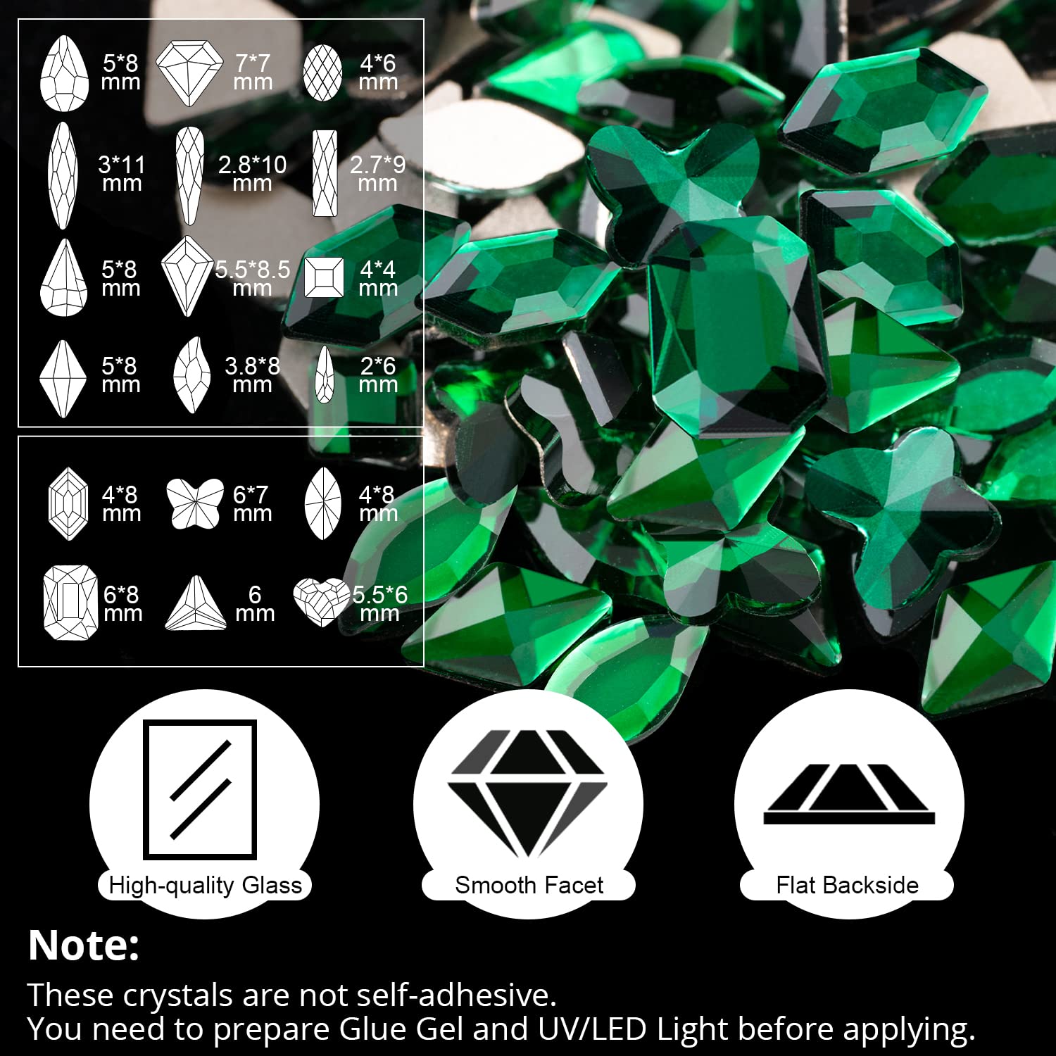 • WHAT YOU WILL RECEIVE -- The package includes 1 box of 12 styles of multi-shaped Dark Green gems, 1 box of mixed round and 6-style multi-shaped Dark Green stones, 1 pickup pencil and 1 tweezer.