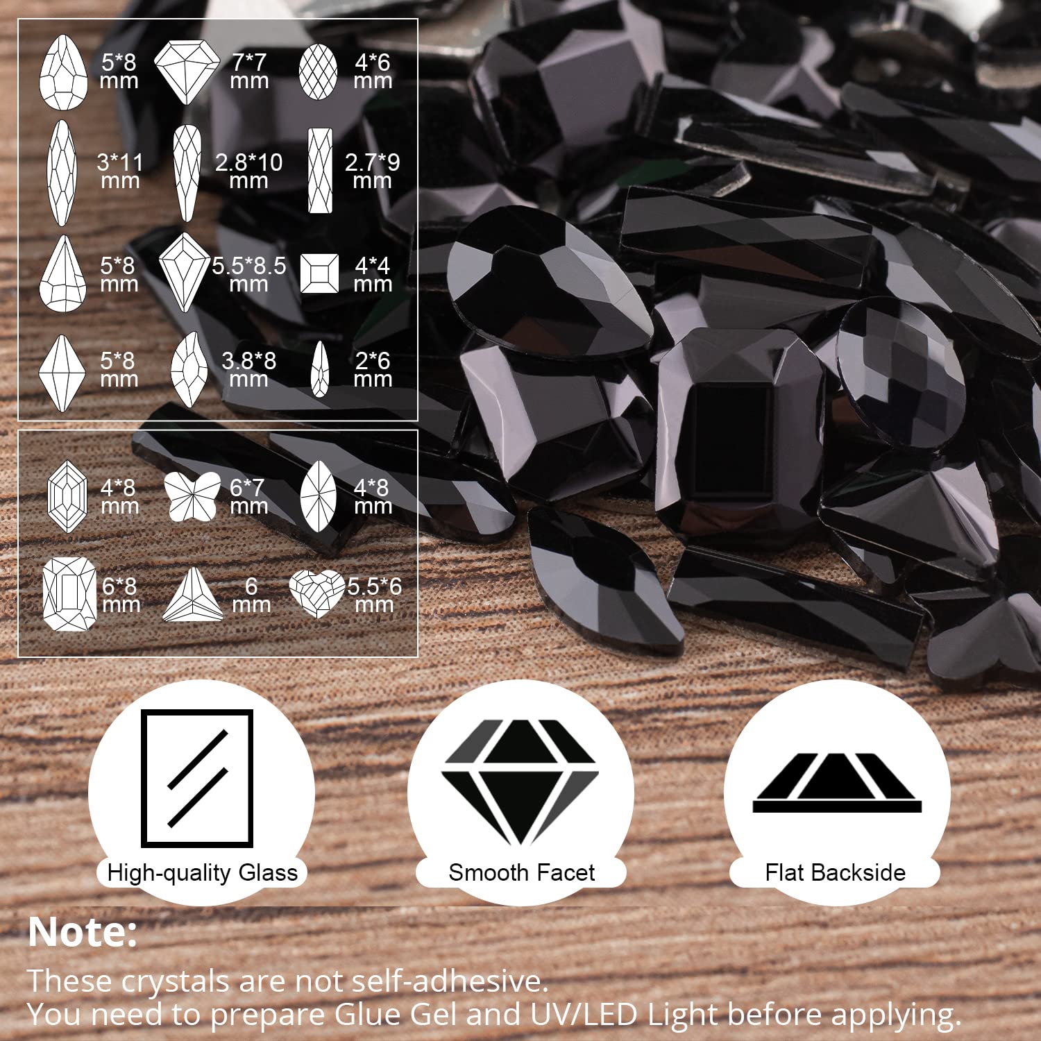 • WHAT YOU WILL RECEIVE -- The package includes 1 box of 12 styles of multi-shaped Black gems, 1 box of mixed round and 6-style multi-shaped Black stones, 1 pickup pencil and 1 tweezer.