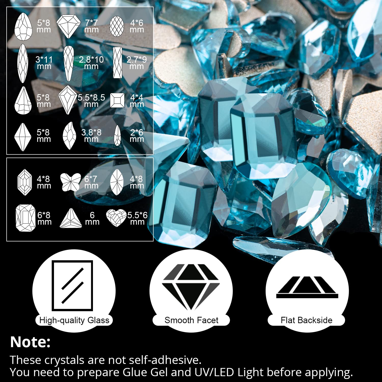 18 Styles Multi-Shaped Glass Gemstones for Nails and 6 Sizes Round Crystal Rhinestones Kit #8, Lake Blue Nail Art Charm Bead Manicure Decoration with Pickup Pencil and Tweezer