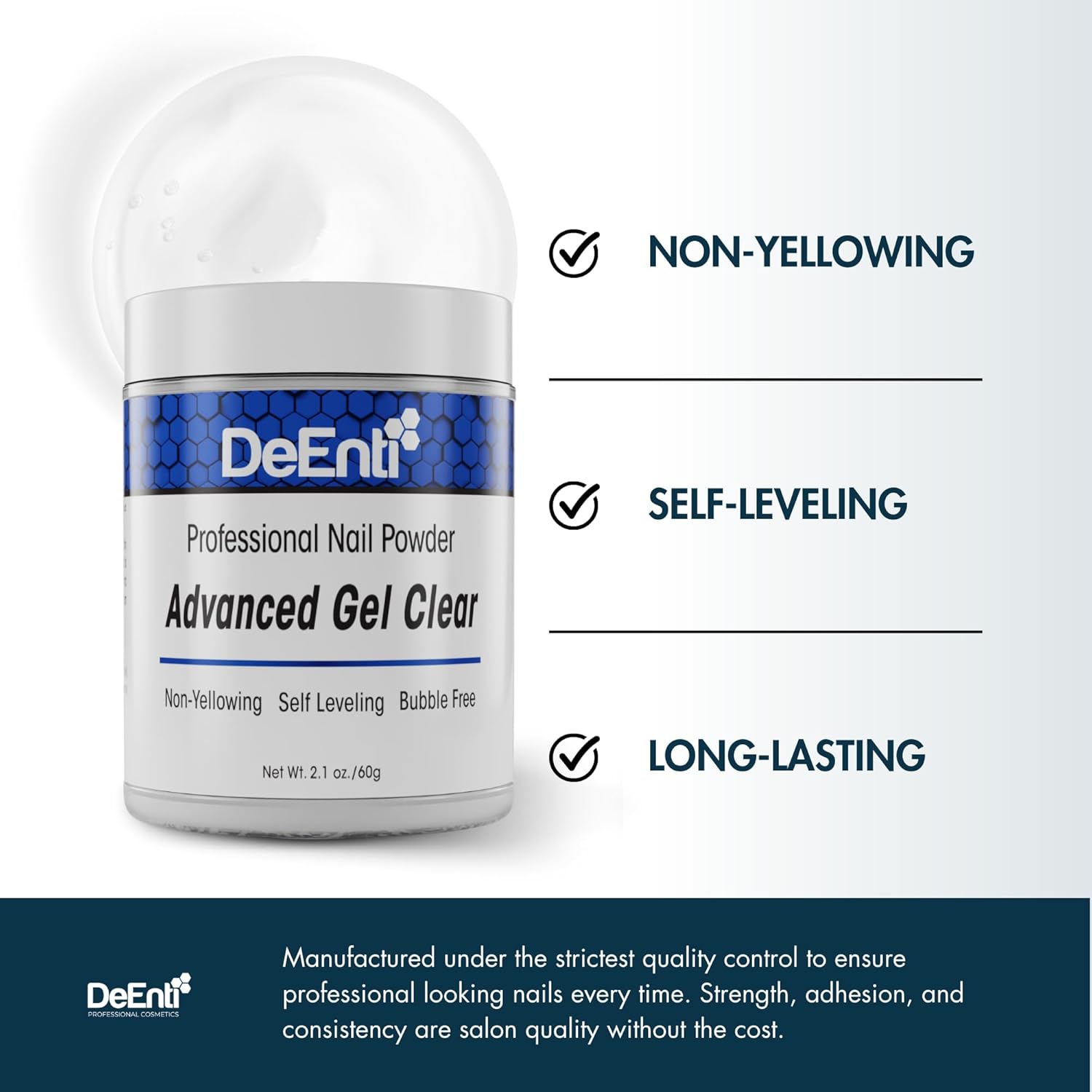 • NON-YELLOWING & SELF LEVELING formula creates smooth, shiny nails without excessive filing and prep. Manufactured under the strictest quality control to ensure professional looking nails every time. Strength, adhesion, and consistency are salon quality without the cost.