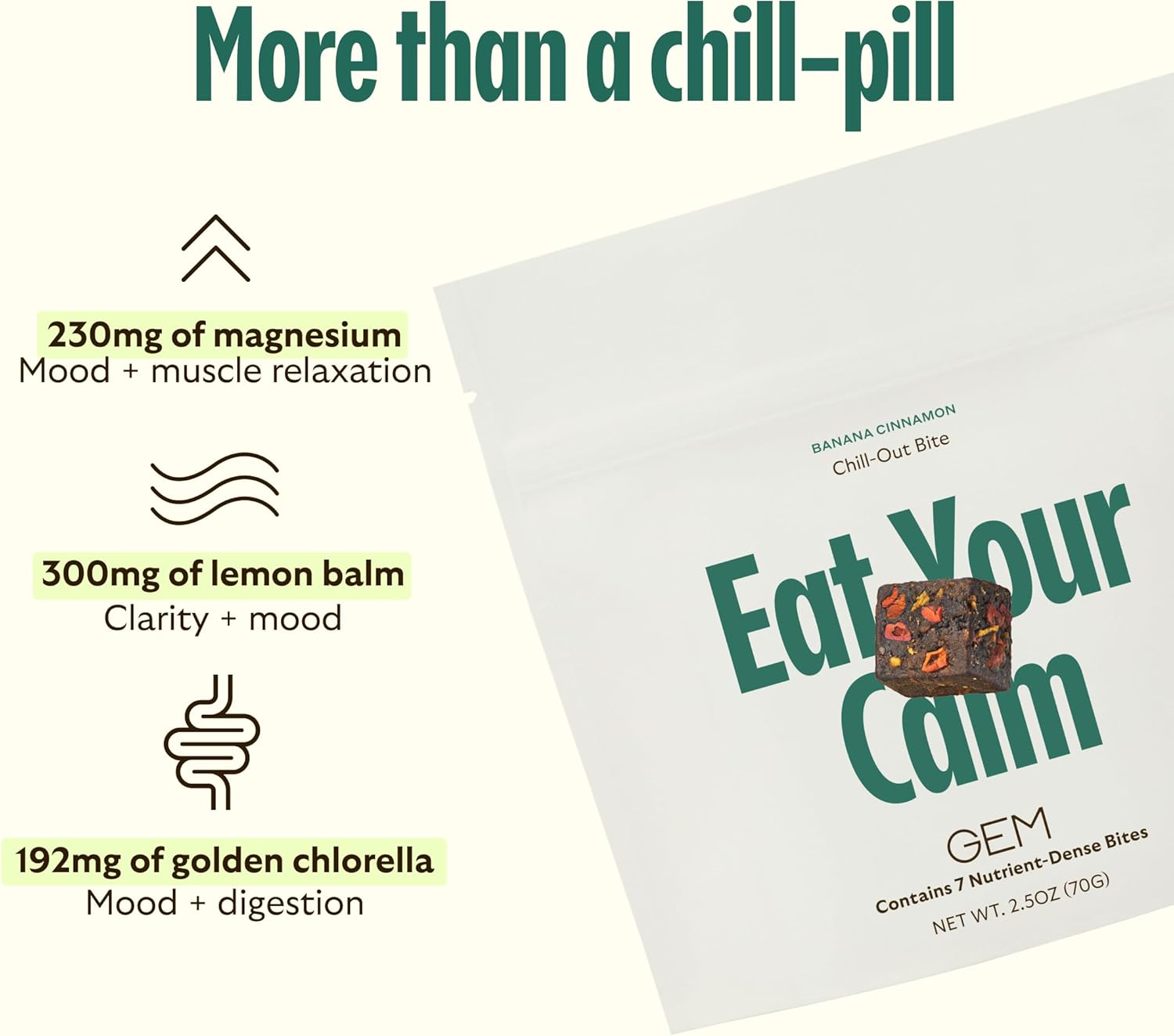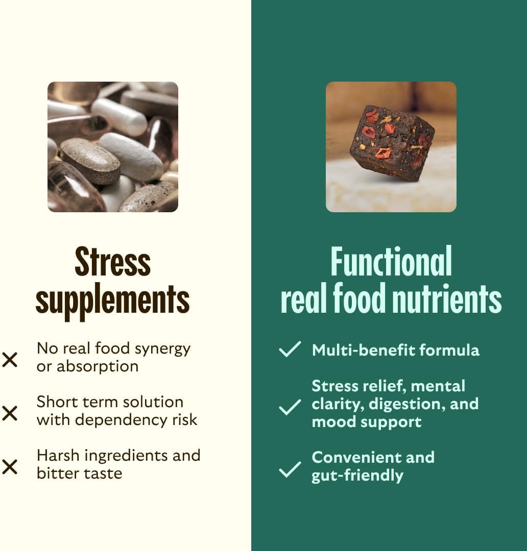 • Boost: Lemon balm and golden chlorella relieve stress, promote focus, and reduce brain fog. One delicious real food Bite filled with 50% of your daily dose of magnesium. Three different forms of magnesium targeting brain, body, and gut for stress, relaxation, and digestive relief. Each bite contains lemon balm with clinical benefits to help with cognition, focus, and mood support.