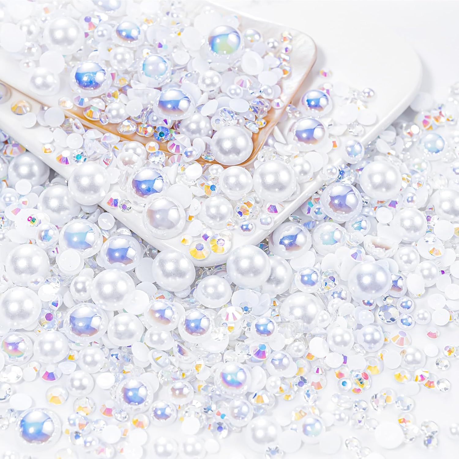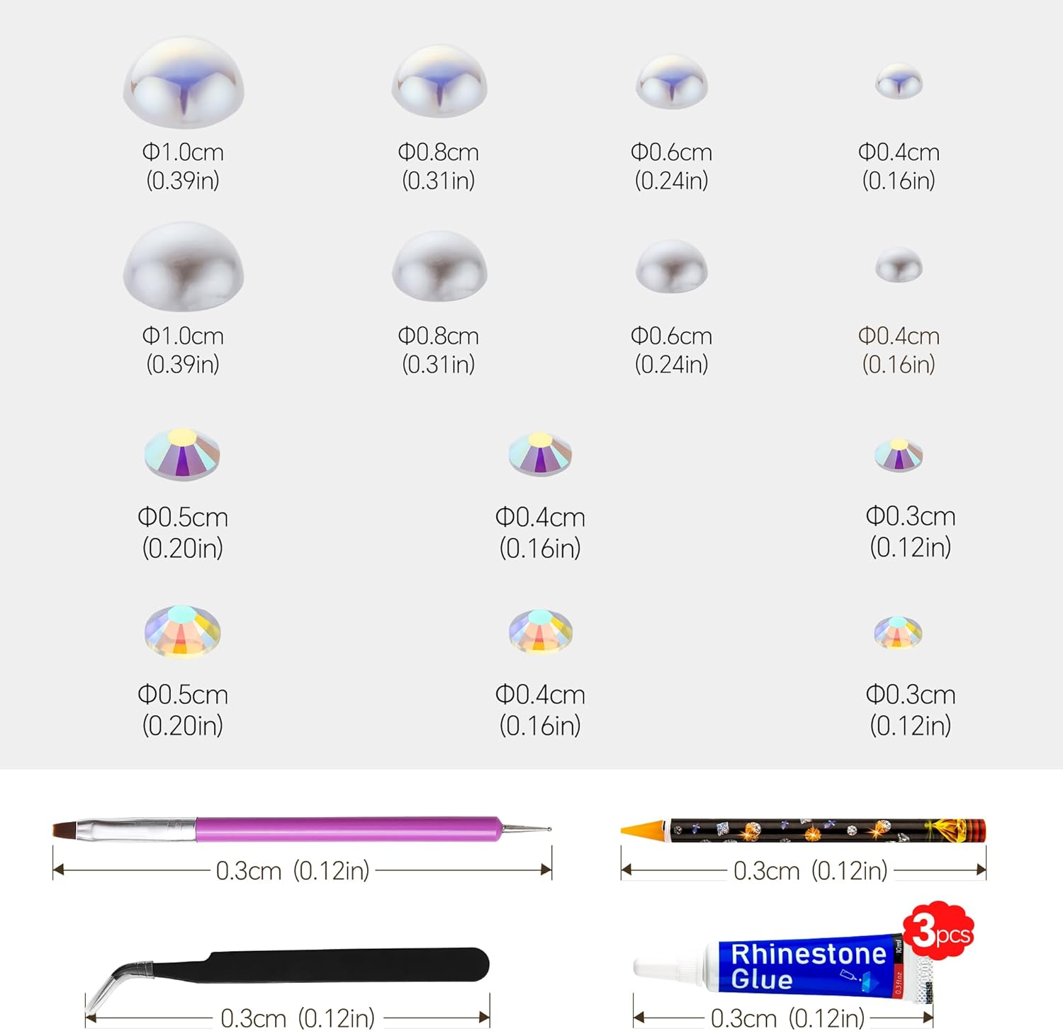 • What You Will Receive: 60g(30g*2)mixed size flat back pearls and rhinestones. 3*Rhinestone Glue. 1* wax pencil for rhinestones. 1*Pencil sharpener(color random). The mix half round pearls and rhinestones can make more beautiful handicrafts for your friends, parents, yourselfs on any festivals.If you need a mixed size pack of pearl rhinestones, search on Amazon:B0BBL1KVMD