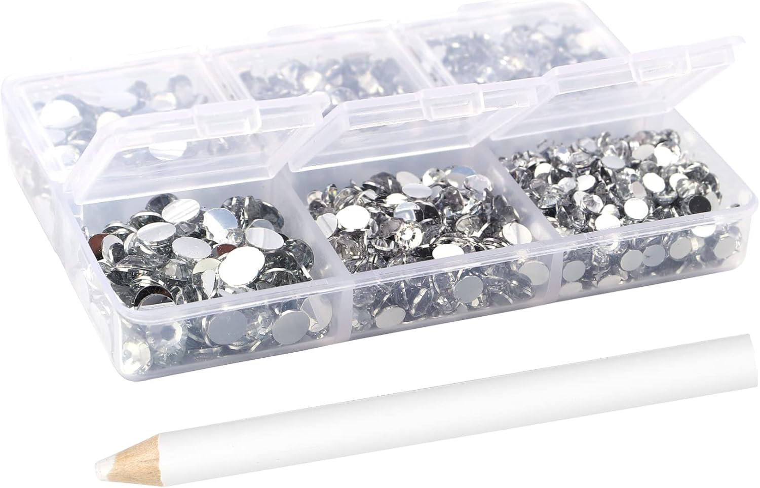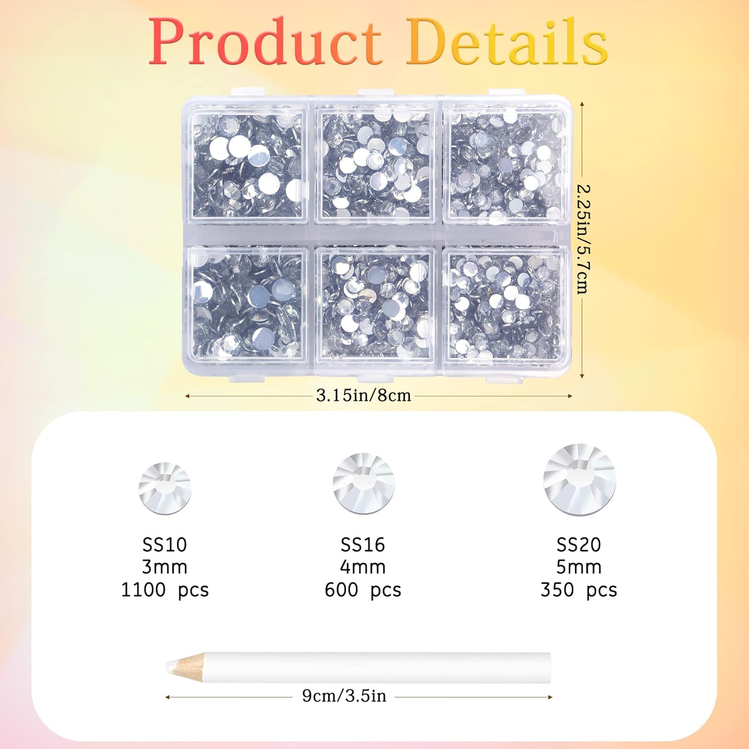 • 3 Sizes Rhinestones Set with Pick Up Pen: 2050 pcs per box. Round flat backs &Non Hotfix, SS10 (3mm) 1100PCS, SS16 (4mm) 600PCS / SS20(5mm) 350PCS.