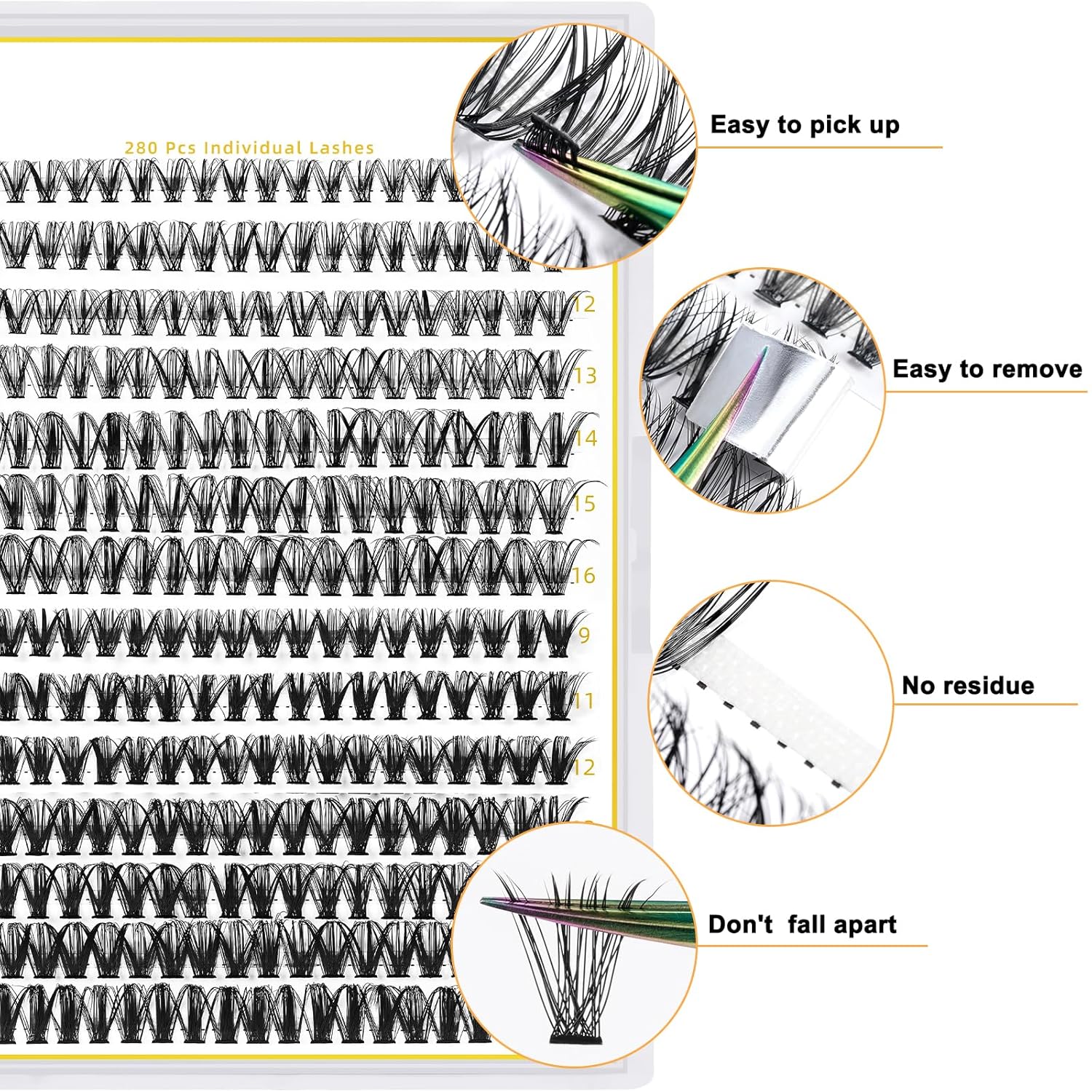 • DIY Individual Clusters at Home: 280 clusters in one tray. You can apply cluster lashes at home by yourself. Easy to put lashes on, gorgeous results, and lash clusters are not easily fall apart. Cluters take less time to complete each eye. Now save so much money and time.