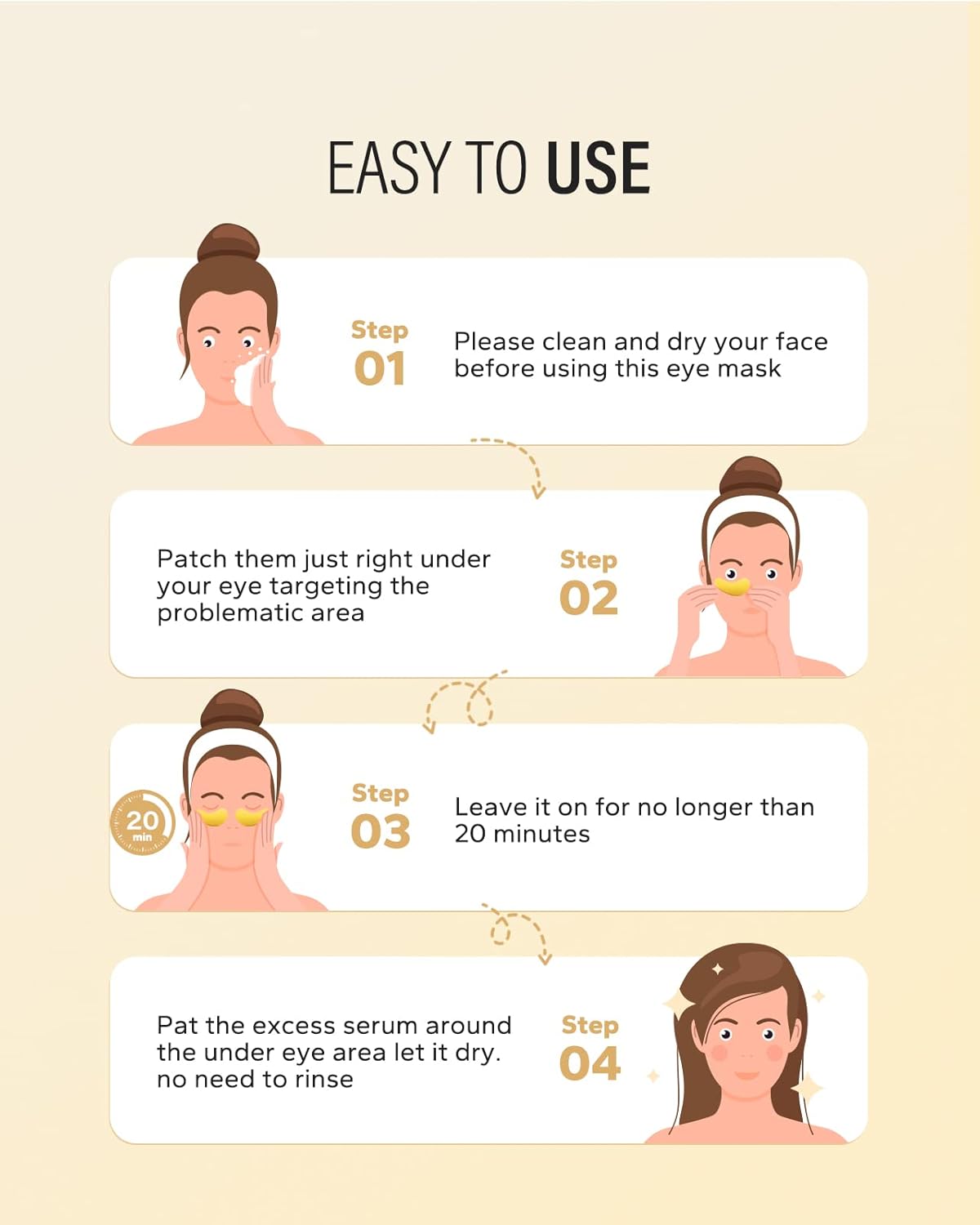 • Easy To Use: Clean your face and eyes with warm water, then put eye pads under your eyes and press gently to secure them. Keep it for 20 minutes, remove the eye pads and gently pat the remaining essence. Twice a day or at least once a week.