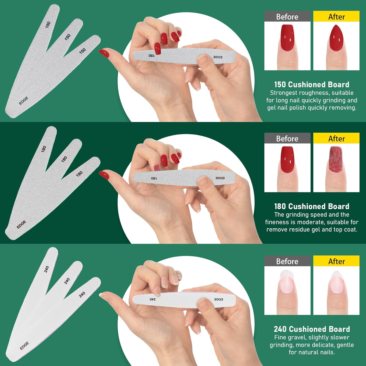 • High Quality Nail File Kit: The nail polish remover set contains 6 pcs nail files of different roughness, each nail file and nail buffer is marked with a corresponding number so you know exactly which file to use for shaping or polishing your nails. Both sides can be used, gentle on natural nails, high tough material is not easy to deformation. (EDGE: 150, 180, 240, FLEX: 100/180, 220/280, SHINER: 1000/4000)