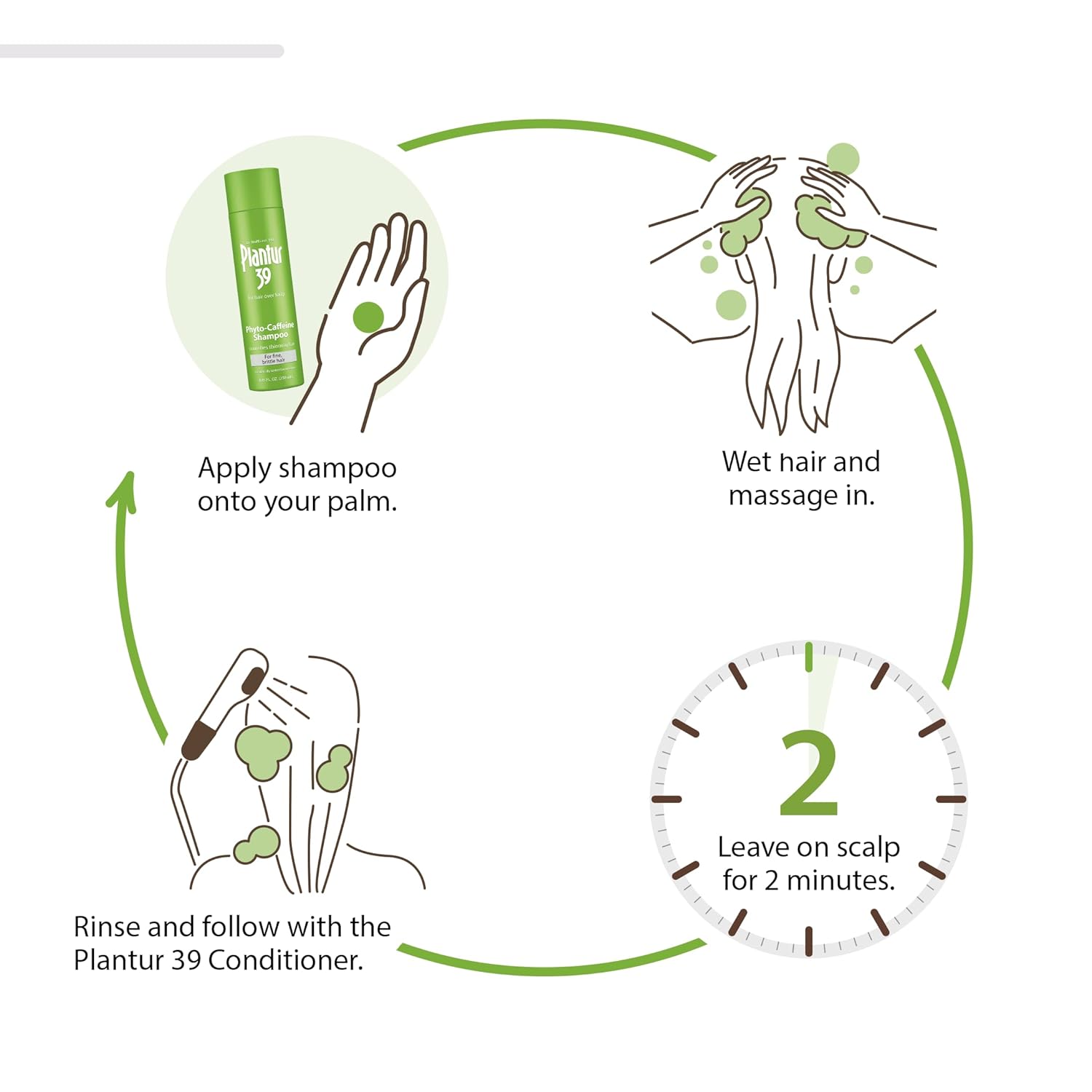 • USE DAILY: for optimum results. Leave on the scalp for 2 minutes from application to rinse. If your hair requires less washing, use our Plantur 39 Phyto-Caffeine Scalp Tonic in between shampoos. For best results, use with Plantur 39 Phyto-Caffeine Scalp Tonic containing castor oil