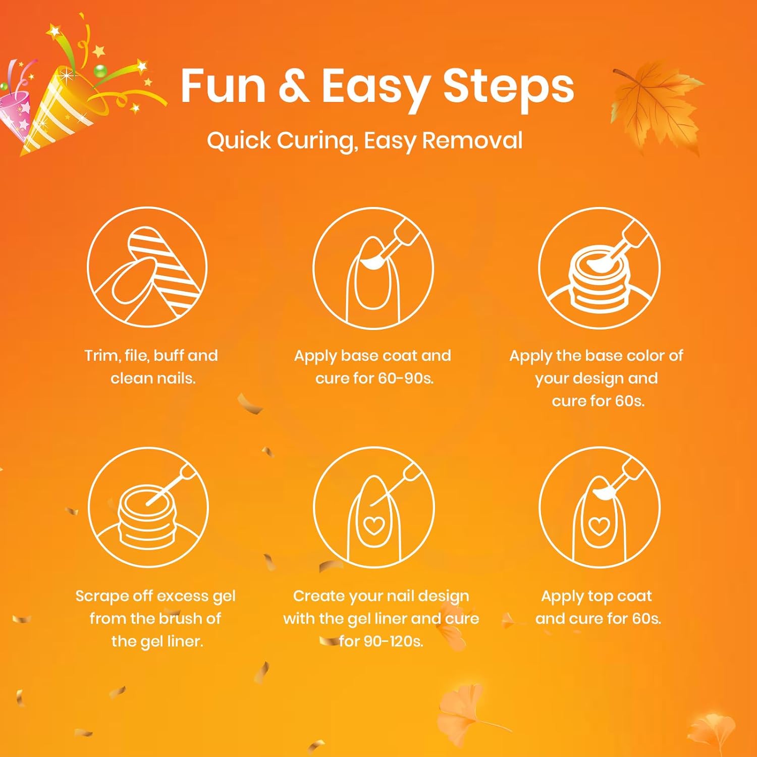 • Application: Just make sure you wipe your brush; otherwise, you’ll get a big drop. This is a french tip nail art liner gel polish. It must be cured using an LED UV Nail Lamp. Base and top coat are required. The average for an LED nail lamp is 60-120 secs.