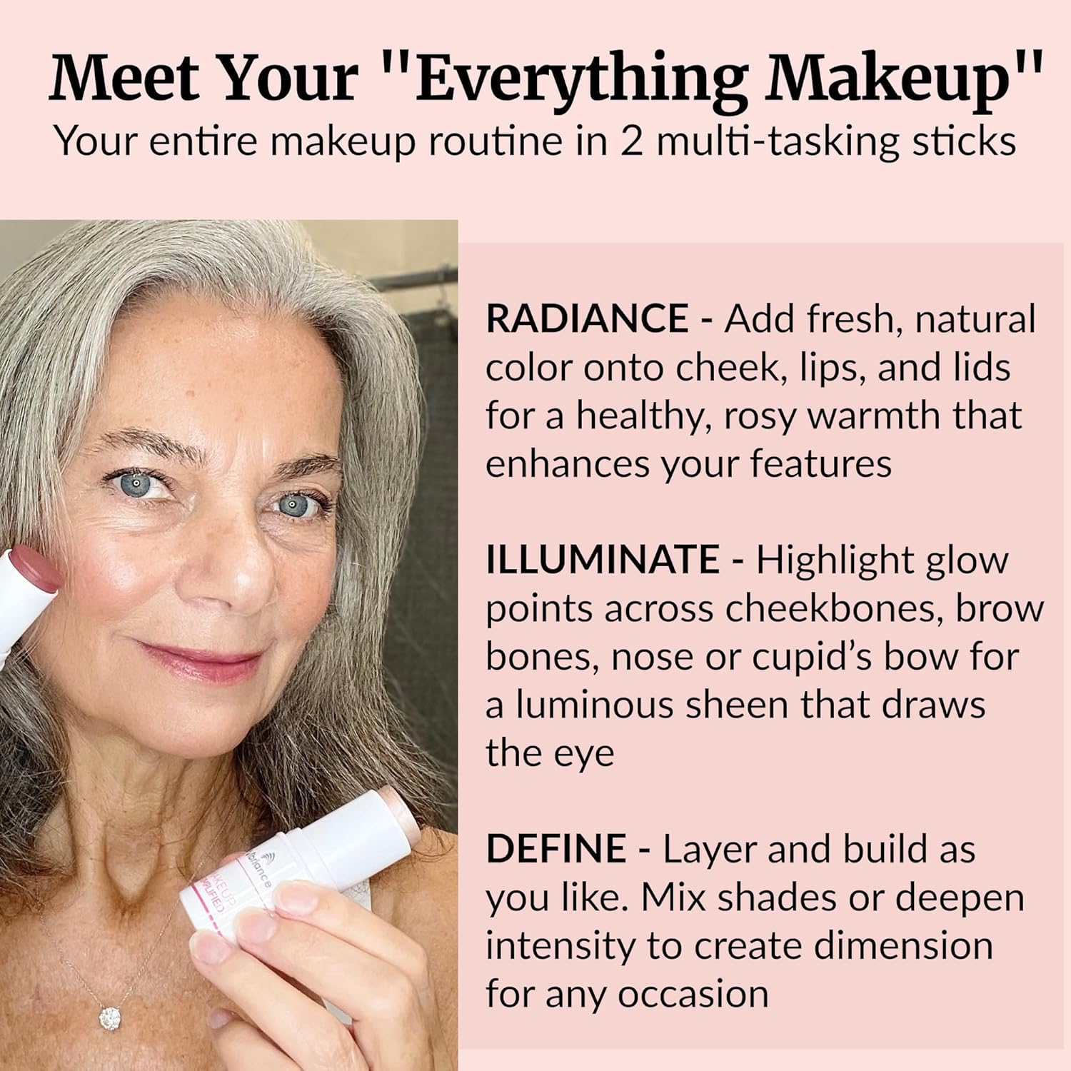 • Scientifically backed beauty - We merge science and beauty. Our makeup sticks are not just cosmetics for older women; they’re skincare products that reflect our dedication to premium, scientifically backed products for older women.