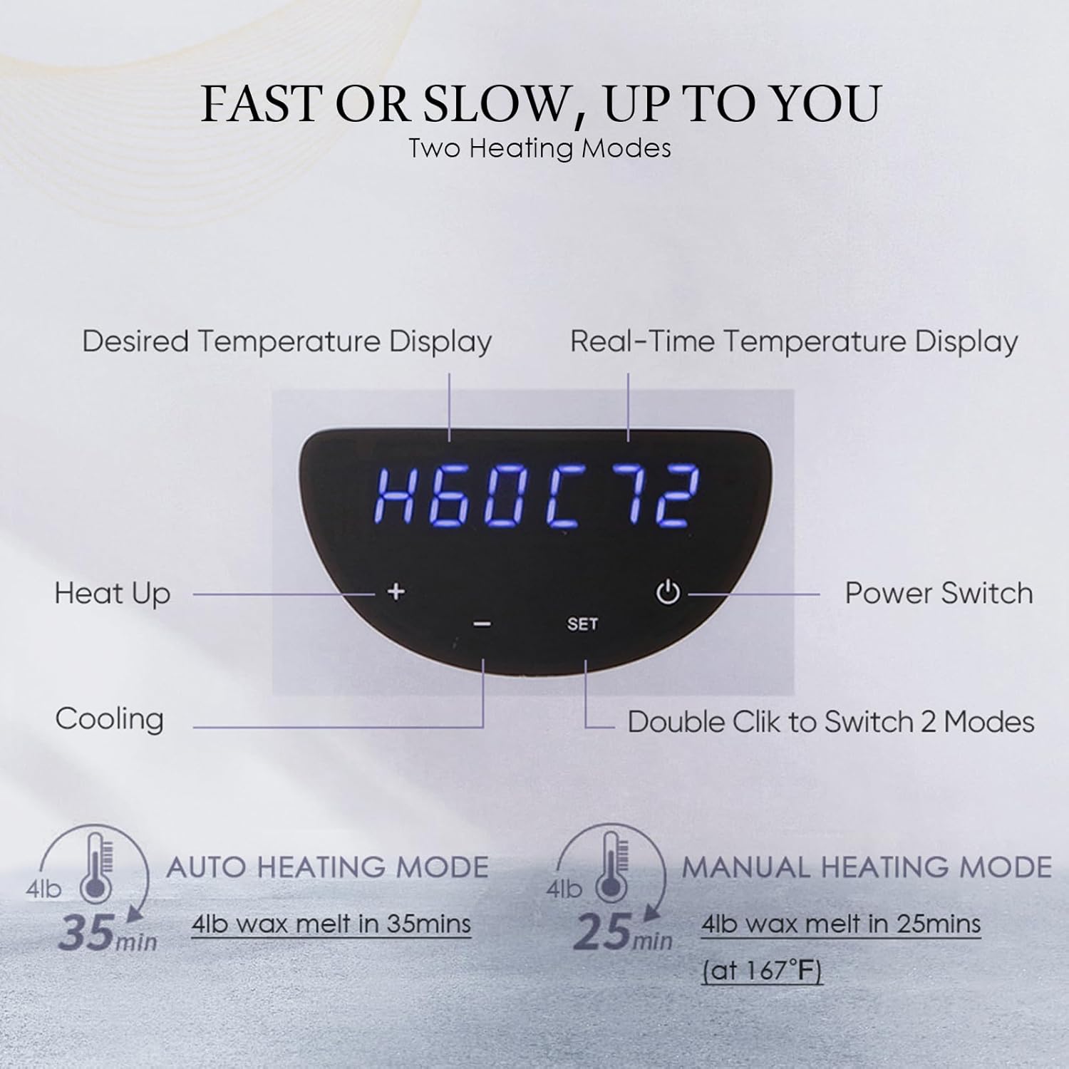 • 24 HOURS SMART BOOKING,REAL TIME TEMPERATURE CONTROL WAX MACHINE - Our paraffin treatment machine is implanted with a patented extra-large thermal control system, bottom probe device, upgraded dual-screen LED panel, real-time monitoring of temperature changes, and a sound prompt will be given at a suitable temperature of 131Β°F, and the machine will automatically enter the constant temperature mode。 No scalding anymore when enjoying your paraffin wax spa.