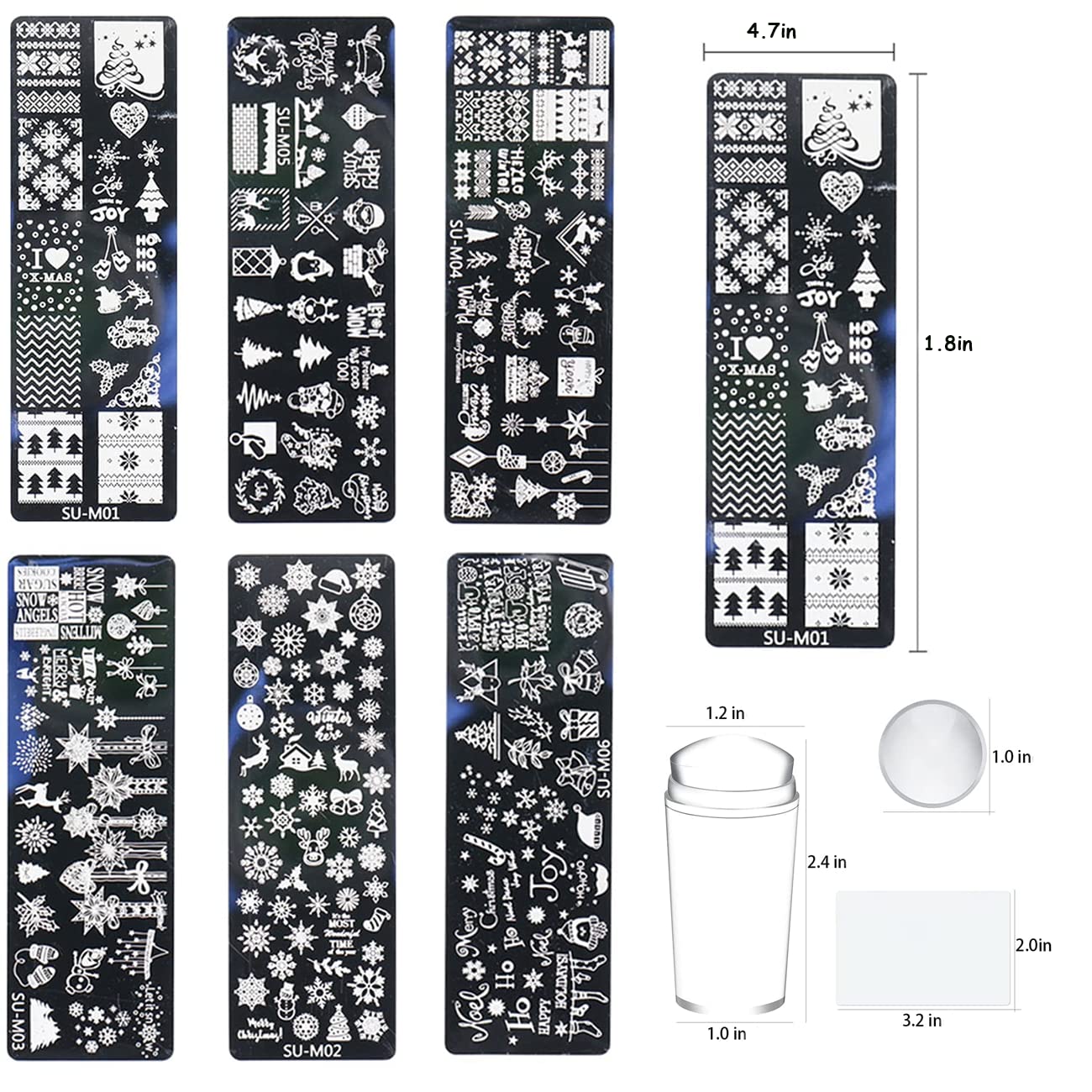 • [Package]:You will get Christmas nail art stamping set includes 6pcs nail stamping plates, 1 Stamper, 1 Lace scraper, and the size of each stamping plate is 4.72*1.57 inch.