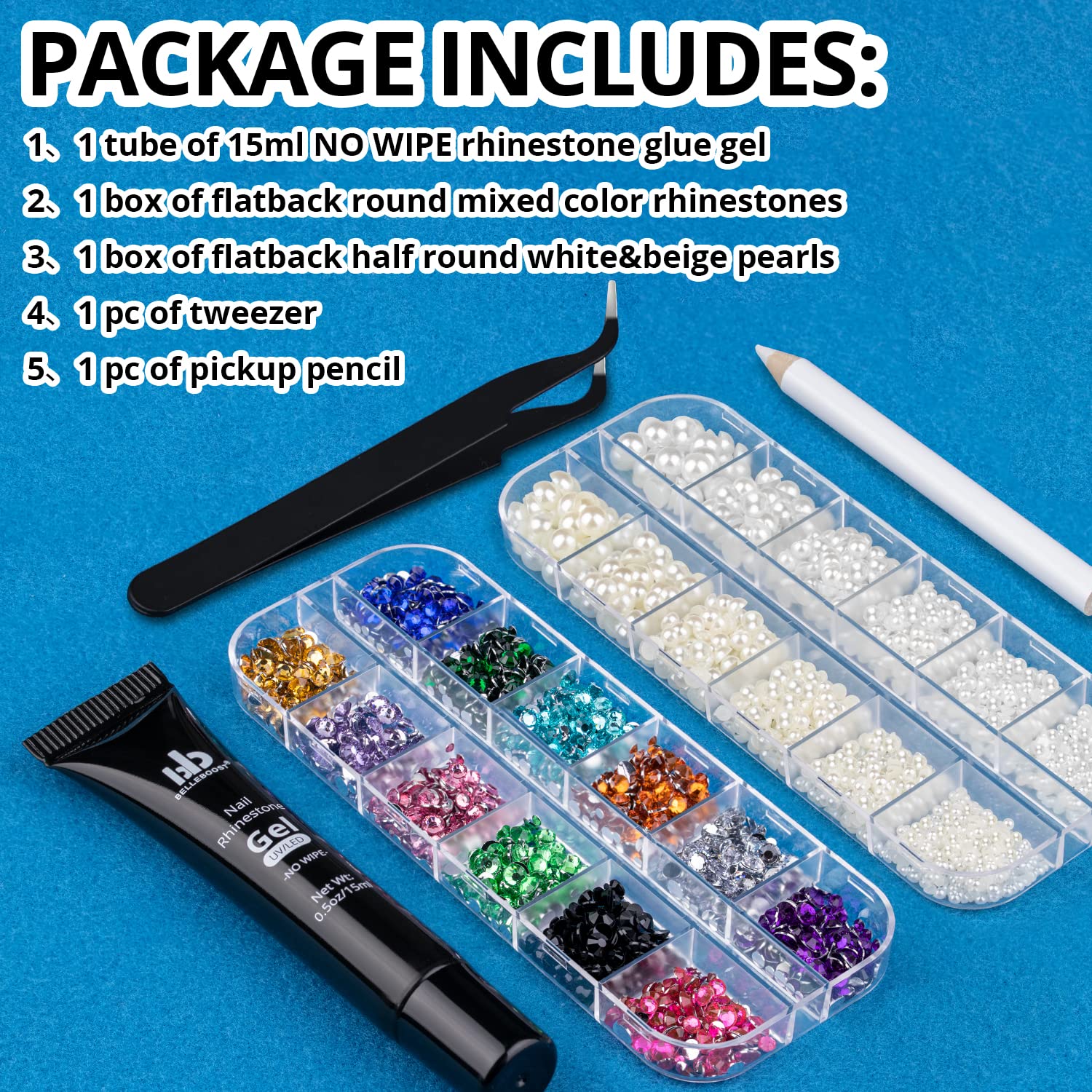 • 💎WHAT YOU WILL RECEIVE: This package contains 1 pc of 15ml tube design NO WIPE rhinestone gel glue; 1 box of flat back round mixed color rhinestones; 1 box of white&beige half round pearls; 1 pc of picker pencil and 1 pc of tweezer. This set helps you decorate your nails more conveniently.