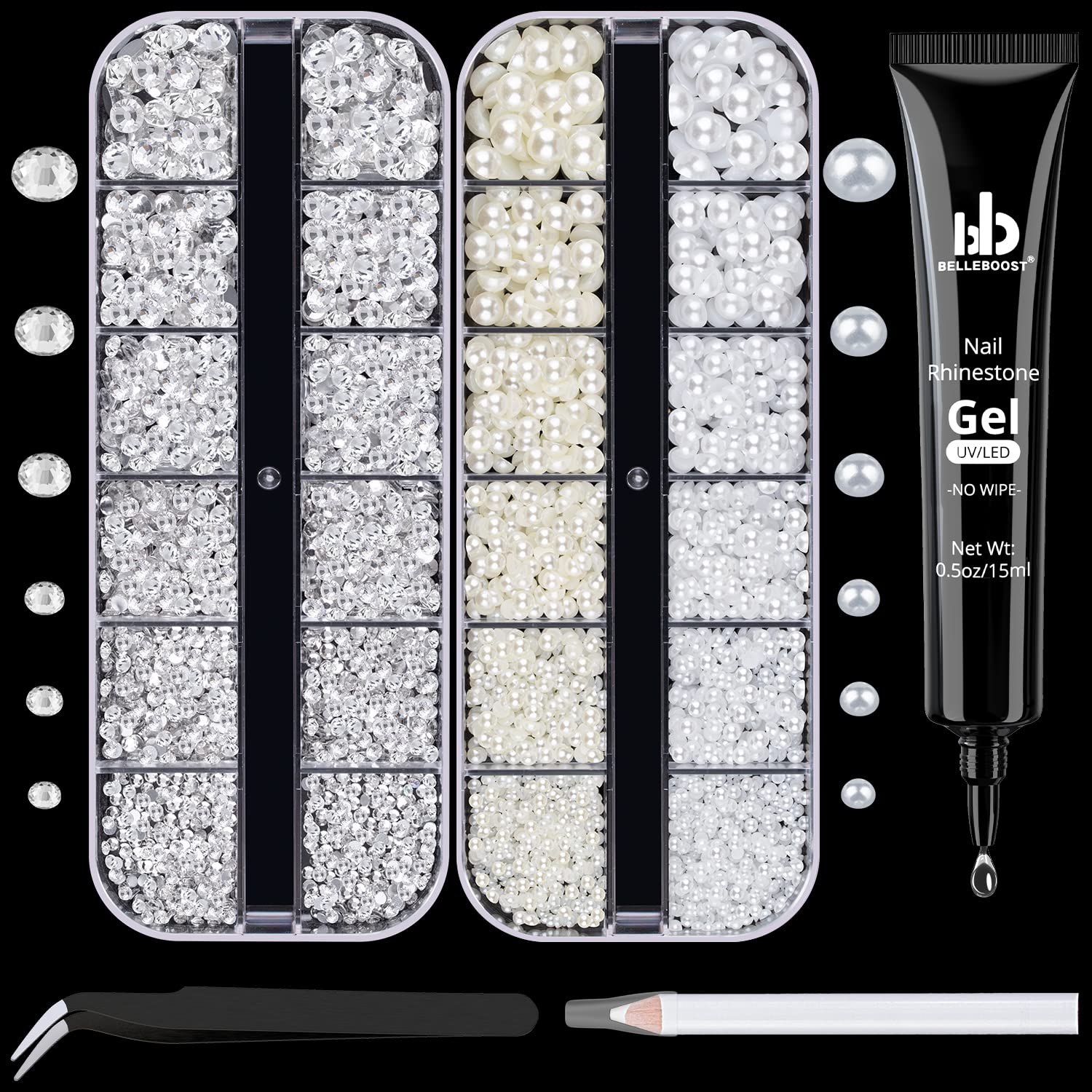 Nail Art Rhinestone Glue Gel&2 Boxes Flatback Gems Kit, 1 Tube of 15ml Rhinestone Gel Glue(UV/LED Needed)+Round Clear Gems+Flat-Back Half Round White&Beige Pearls with Pickup Tools