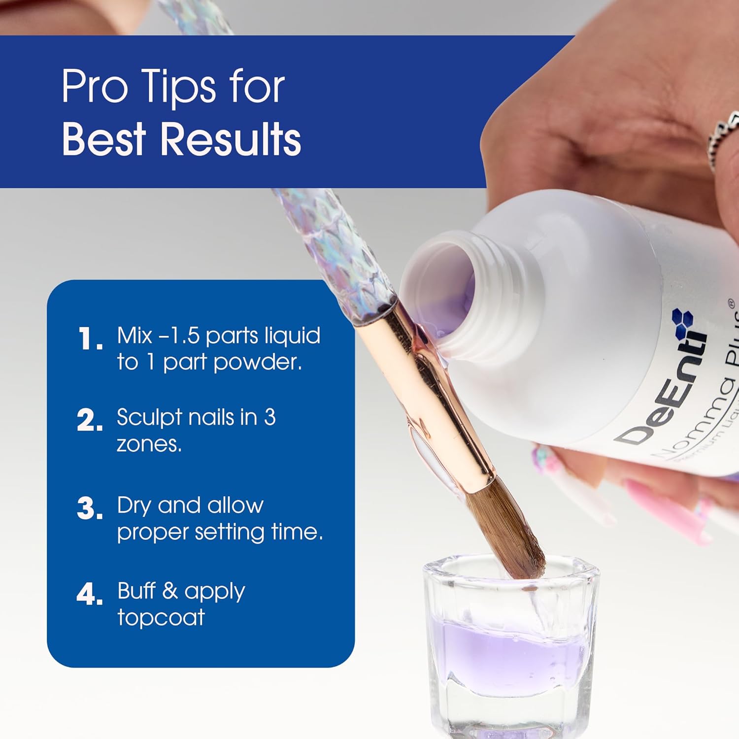 • TO USE sculpt the nail in three zones. Mix ratio of 1.5 parts liquid to 1 part powder. Allow to dry, then continue with manicure.