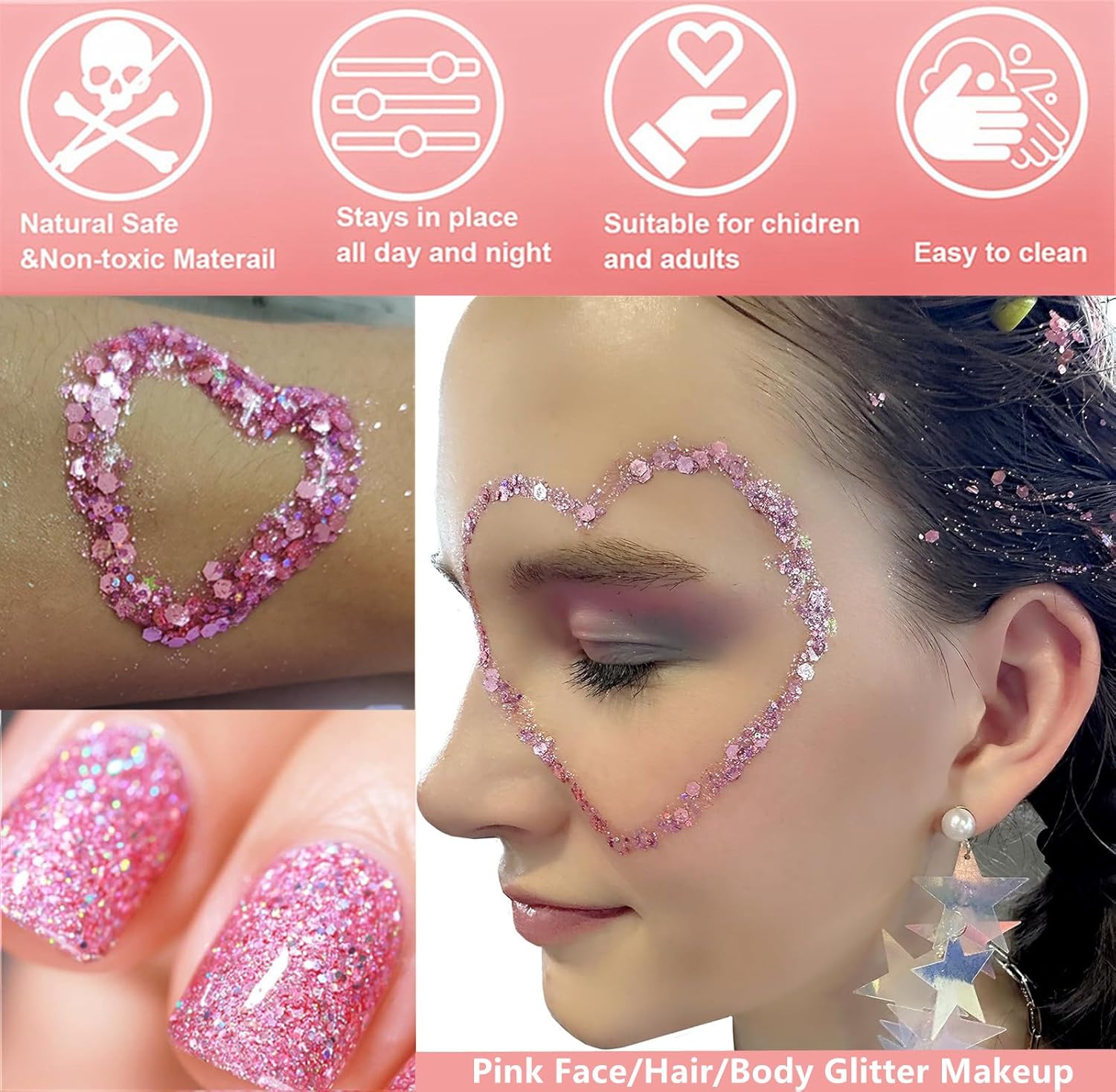 Go Ho Pink Face Body Glitter Gel,Singer Concerts Pink Face Paint Makeup Holographic Chunky Sequins Glitters for Lip/Hair/Nails,Music Disco Outfit for Woman,Festival Rave Accessories,52g