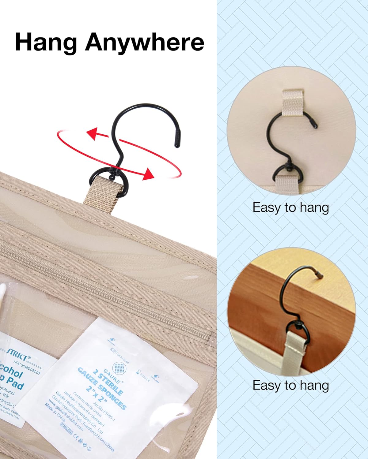 • 𝐂𝐨𝐧𝐯𝐞𝐧𝐢𝐞𝐧𝐭 𝐃𝐞𝐬𝐢𝐠𝐧: Stow-away 360-degree swivel non-slip metal hook for versatile hanging options; carry handle doubles as its hanging strap; two-way zipper closure for quick access