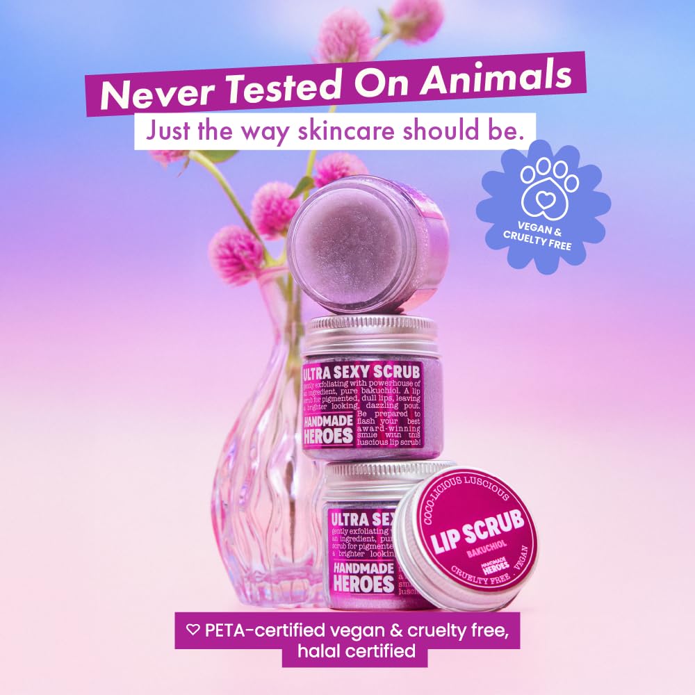 • SMOOTH SOFT LIPS: Handmade Heroes renewing Bakuchiol lip sugar scrub gently buffs away dry flaky skin, lip lines and wrinkles, restoring smooth and supple lips. Natural lip exfoliant safe for sensitive skin