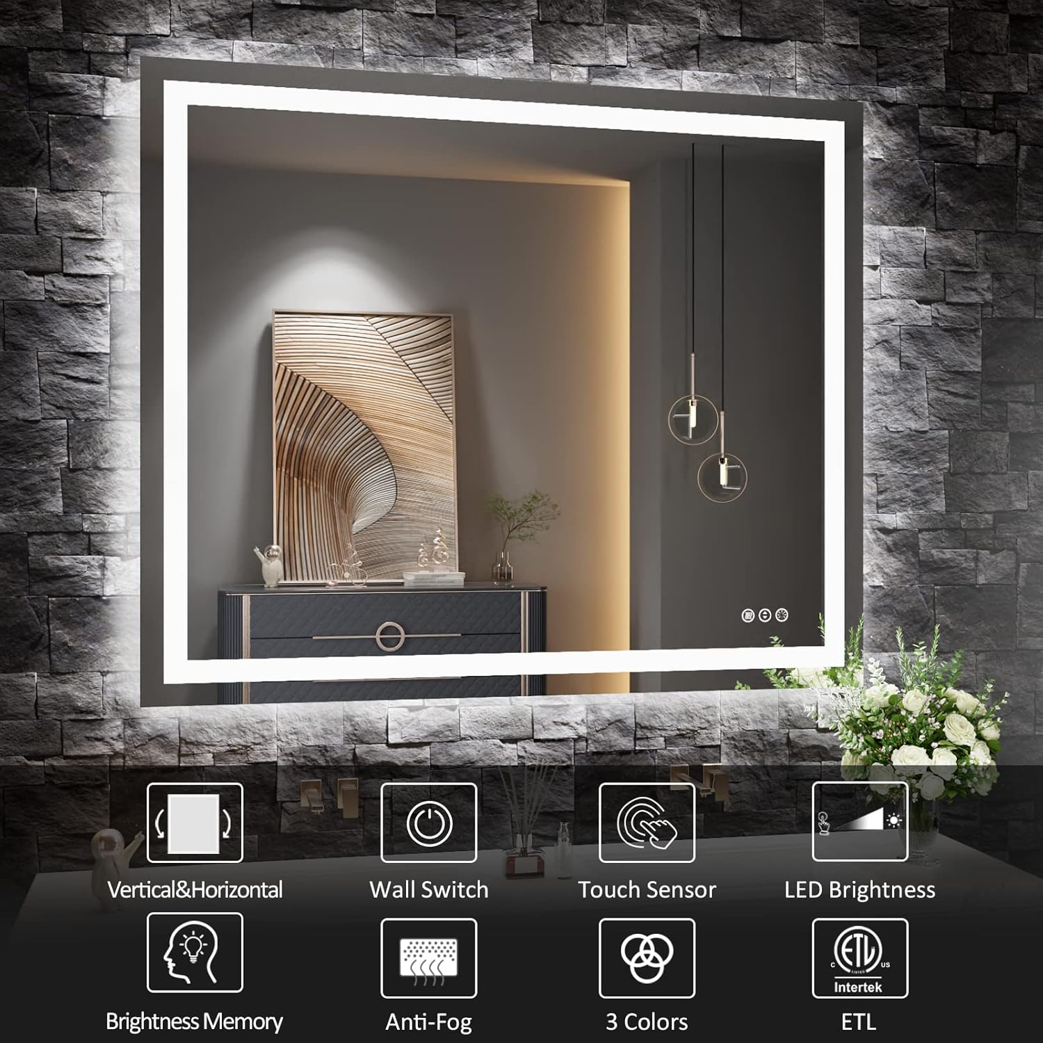 • [Anti-fog]: After a few minutes of opening the defogger, the heater in the mirror will disperse the fog from the center to sides, the mirror will still reflect clearly in the bathroom surrounded by hot air; It will turn on with the power on and automatically turns off after 1 hour