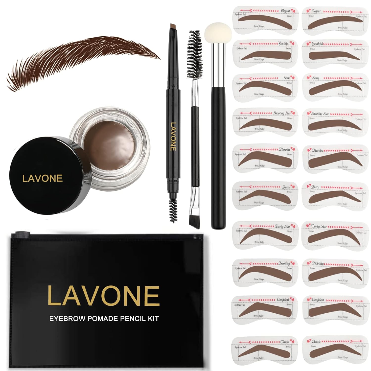 • [What’s in the eyebrow kit]: LAVONE makeup eyebrow kit includes brow pencil (color: dark brown), eyebrow powder(color: dark brown), 20 eyebrow stencils (10 different shapes), a sponge applicator, a dual precision brush and a zipper pouch for on the go.