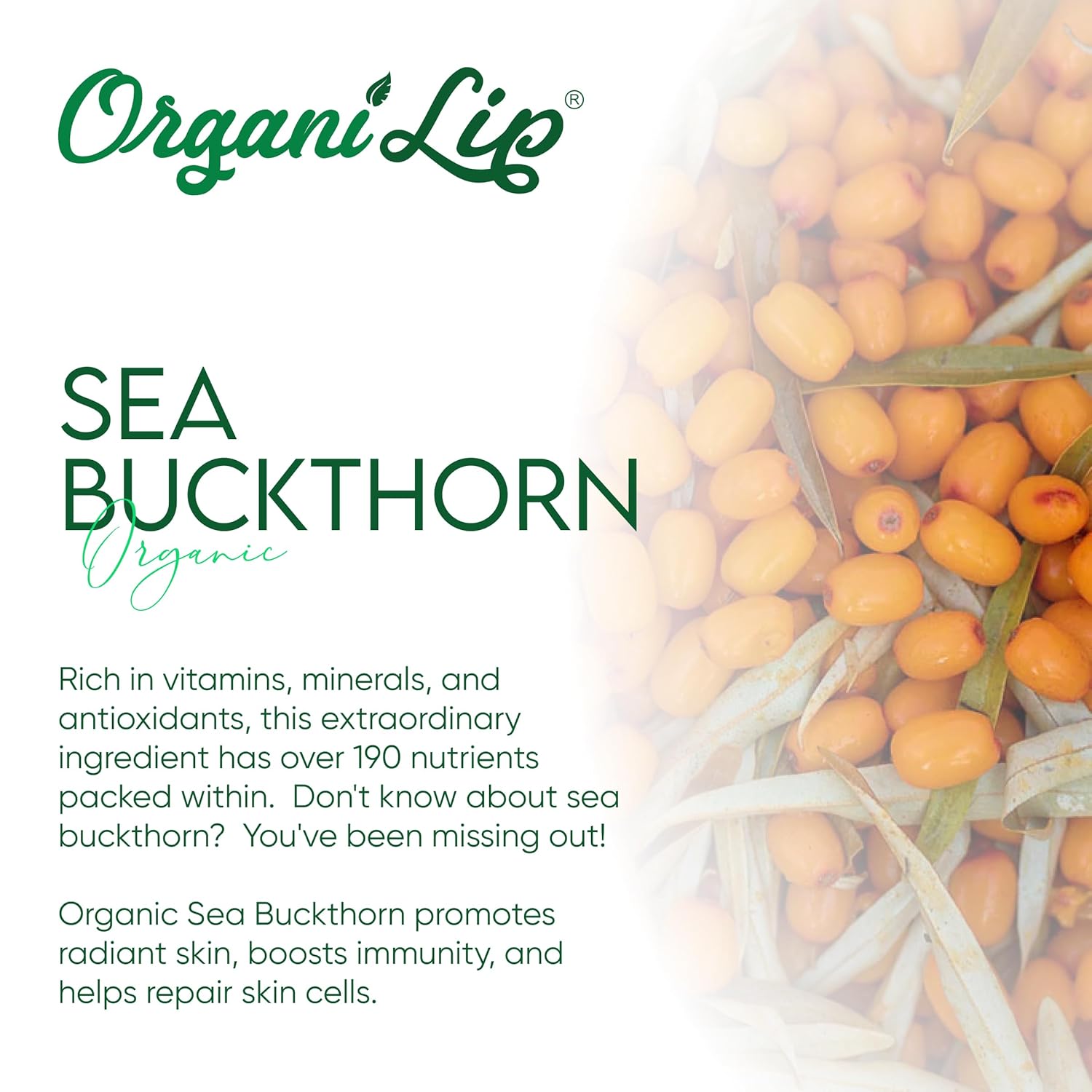 • WHY ORGANIC SEA BUCKTHORN? Sea Buckthorn Oil, derived from the sea buckthorn plant that grows high up in the Himalayas, has over 190 nutrients that promote skin health and contains high amounts of palmitoleic acid, which has skin repairing properties