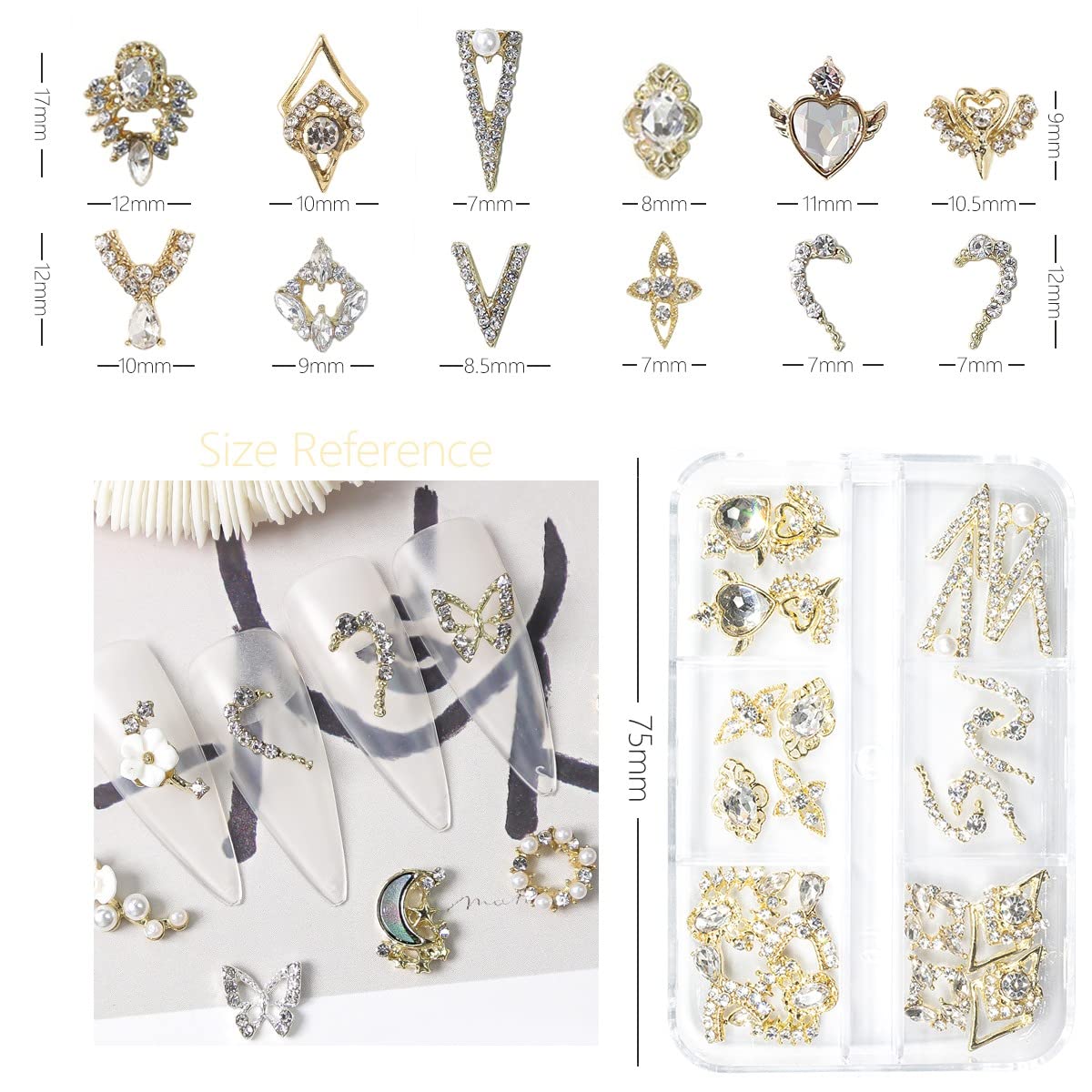 • ❤【12 Different Delicate Luxury Style Design】The gold luxury nail art supplies are designed with heart, sceptre, triangle, V-Shape, Necklace and other different shapes, inlaid with pearls, diamonds and rhinestones, looks luxurious and shiny. These nail art decoration can make your nails very elegant. The big nail charm stones will look perfect with other nail art design items, just go and show your imagination. You can combine some other qiipii rhinestones to DIY design.