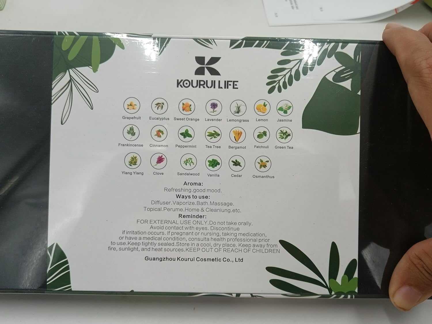 • 20 BOTTLES DIFFERENT FRAGRANCE OIL - - The organic essential oils with 20 different scence, include Ylang Ylang, Patchouli, Cedar, Clove, Green Tea, Osmanthus, Jasmine, Sandalwood, Vanilla, Lemon, Grapefruit, Eucalyptus, Cinnamon, Sweet Orange, Lemongrass, Frankincense, Peppermint, Tea Tree, Bergamot, Lavender oils.