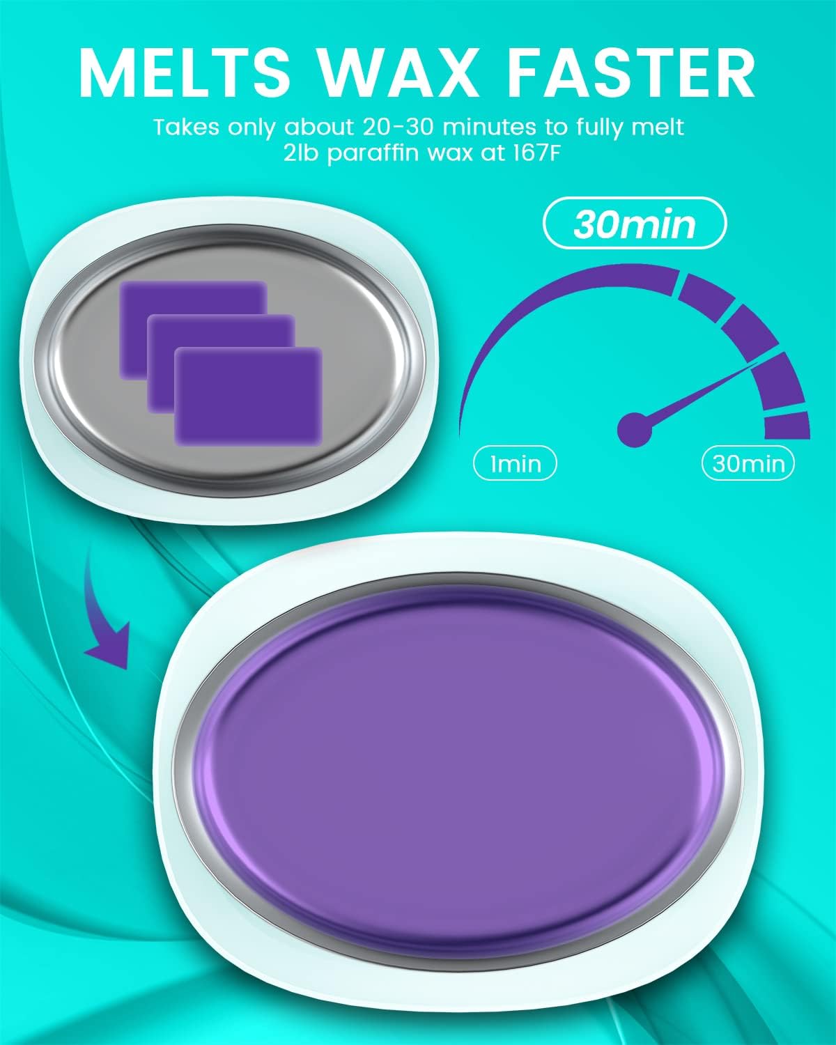 • Large Capacity / Quick Heat: paraffin wax machine has a large opening inner container , which offers you enough space to dip your hands, elbows or feet in paraffin warmer machine. Melts wax quickly and evenly , takes just 30 minutes to fully melt 2 lbs of paraffin wax at 167 °F. Turn Off the machine when dipping