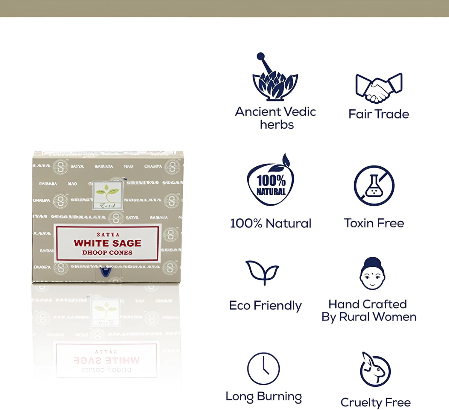 • ✅ 144 Dhoop Cones in 12 Boxes: Each pack contains 12 boxes, each filled with 12 earthy and soothing white sage-scented dhoop cones, providing you with a total of 144 cones for long-lasting use.