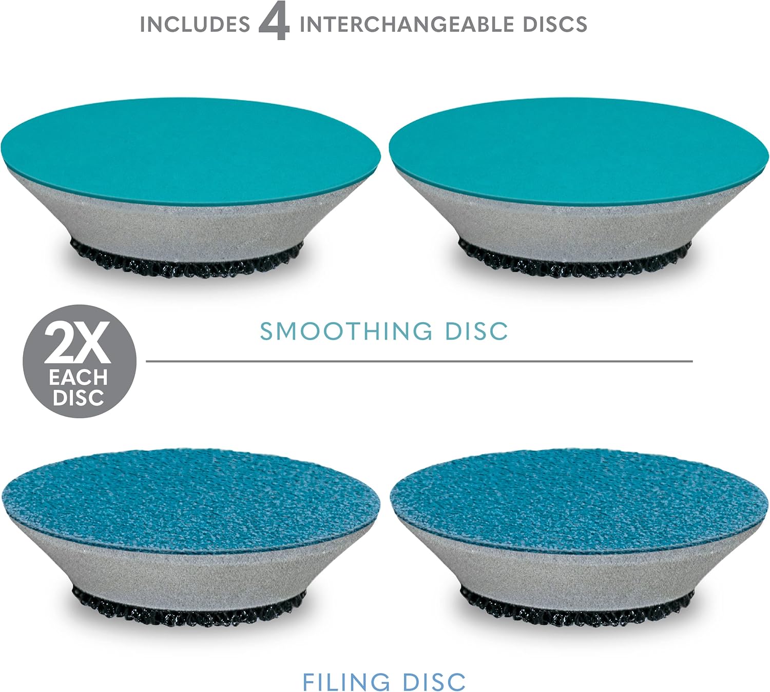 • TWO GROOMING DISCS with rough and smooth grit are mounted on a flexible, foam core to bend to the contours of the foot, allowing for a more comfortable filing experience.