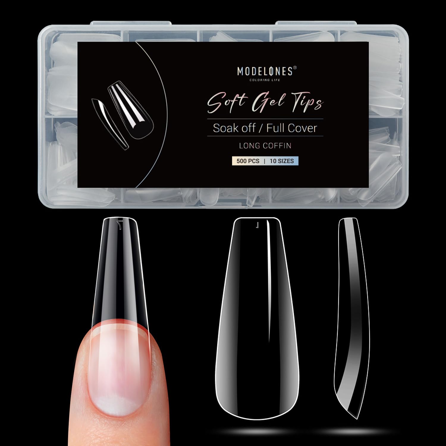 Modelones Long Coffin Nail Tips - 500Pcs Fake Nails Gel Clear Soft Acrylic Press on Pre-shape Full Cover Gel Extension Home DIY Salon Art Design 10 Sizes